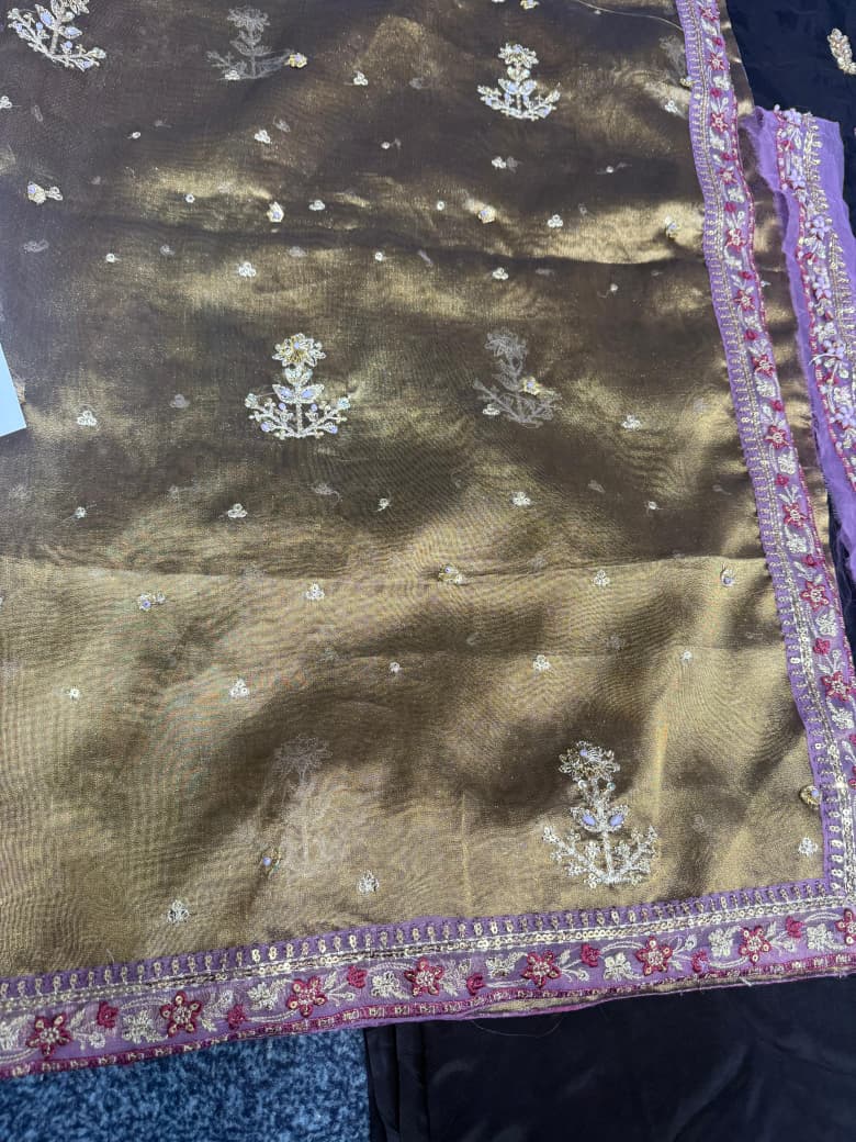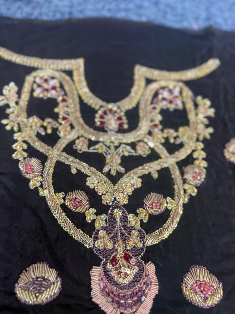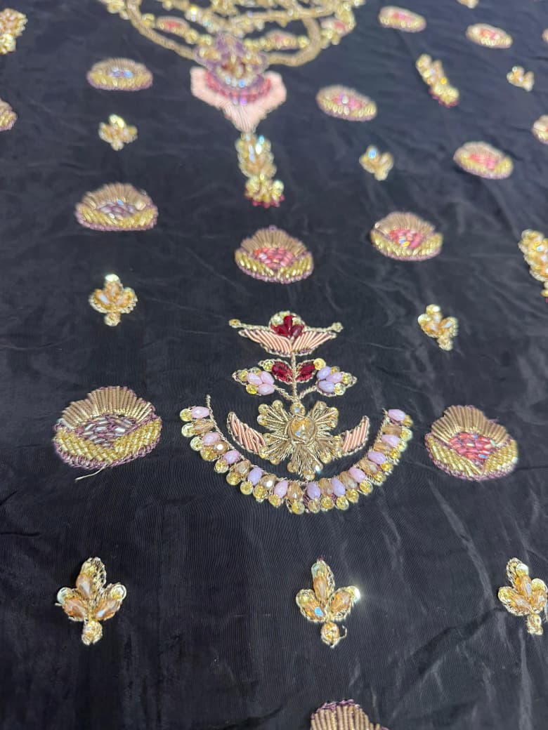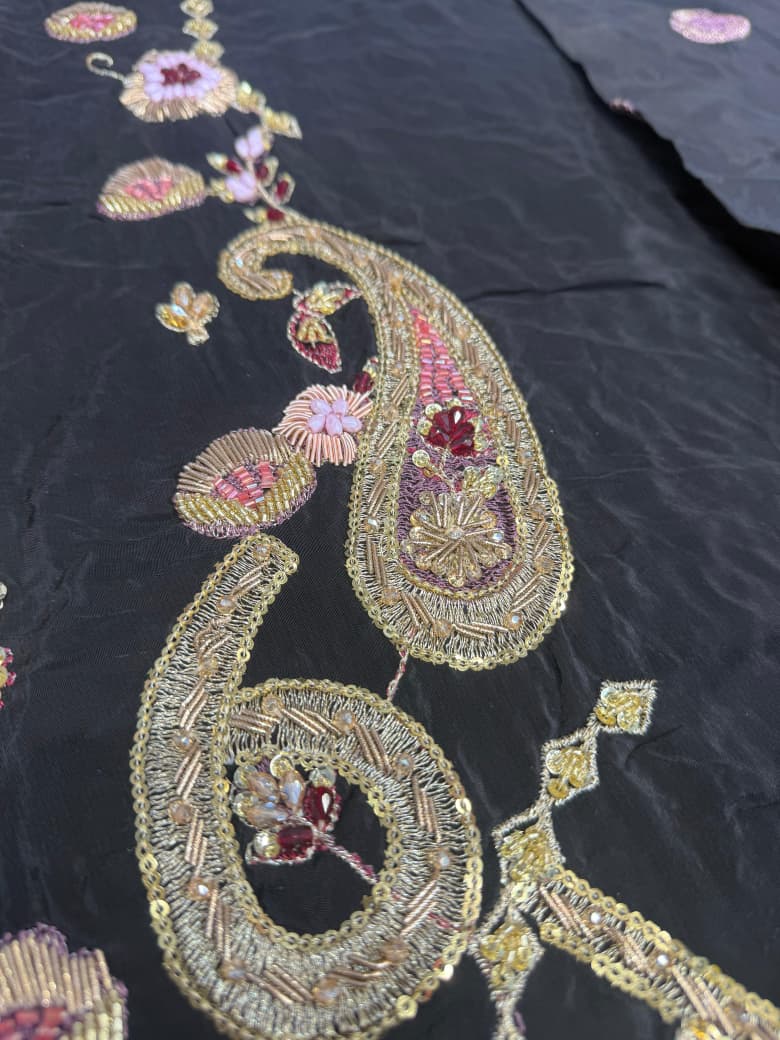 An elegant black raw silk ensemble featuring a hand embellished neckline and sleeves with delicate sequins and borders. Paired with raw silk izaar pants and a richly embroidered olive tissue dupatta, this timeless look is perfect for formal occasions. For added versatility, style it with our signature chunri chaddar in pure silk with intricate kaamdaani.