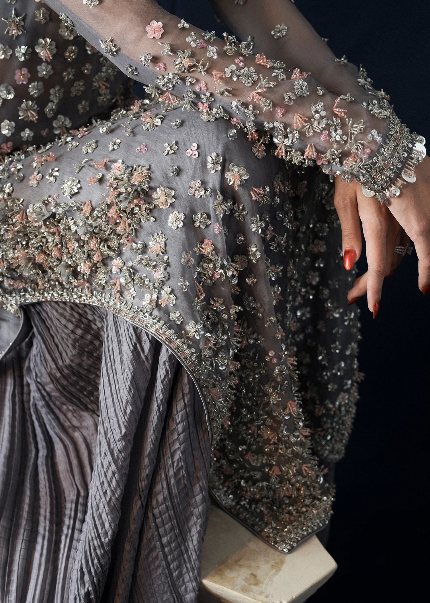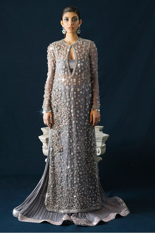 - Elegance personified! This grey ensemble features intricate hand embellishments, 3D floral motifs, and sequin-sprayed organza dupatta. Crushed silk sharara with embellished borders completes the stunning look