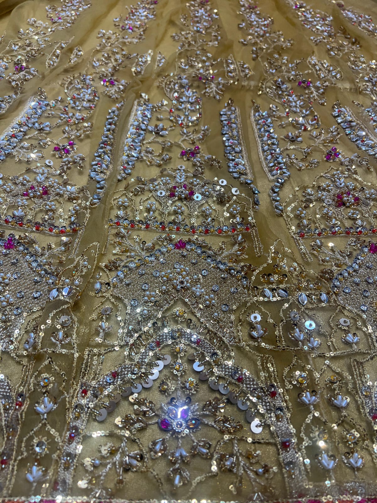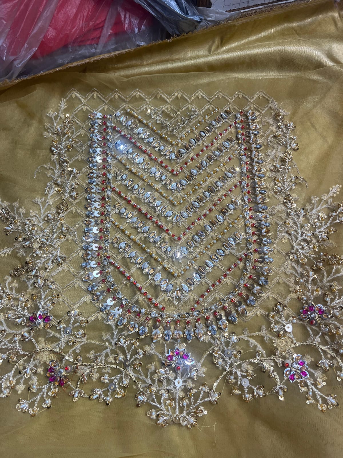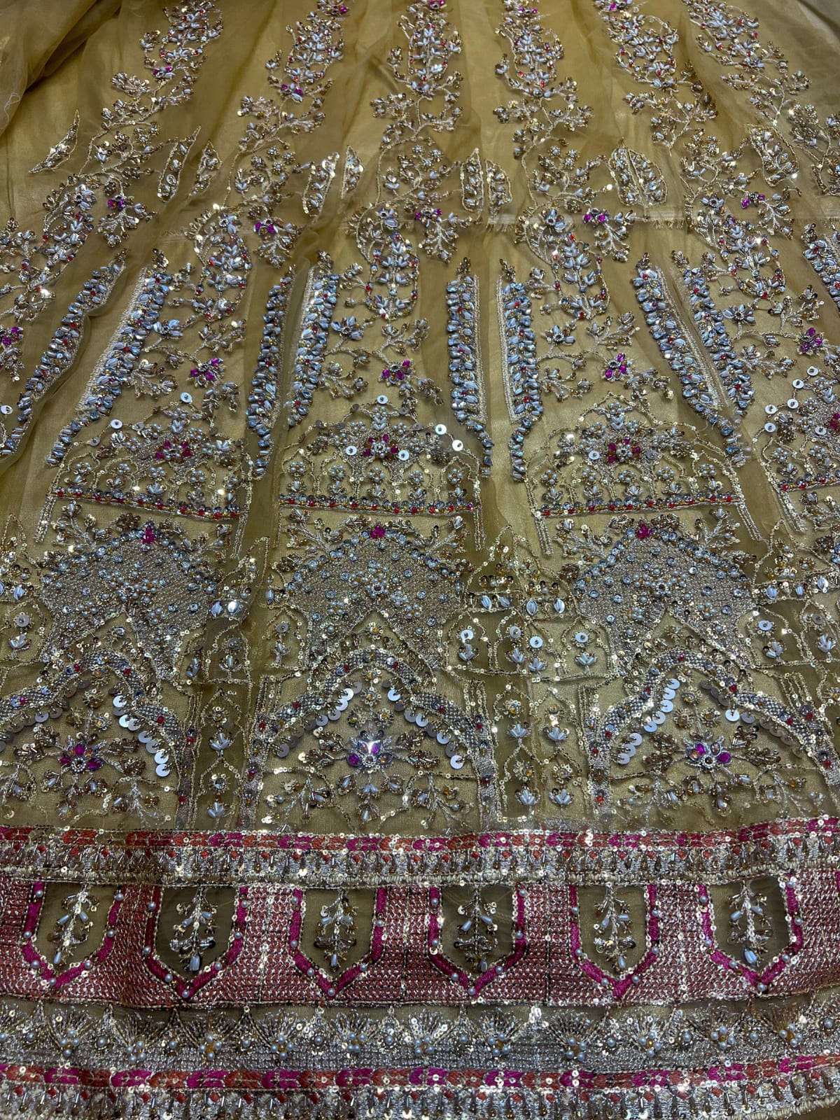 - Heavily handwork front 6 panels on bareeze net fabric.