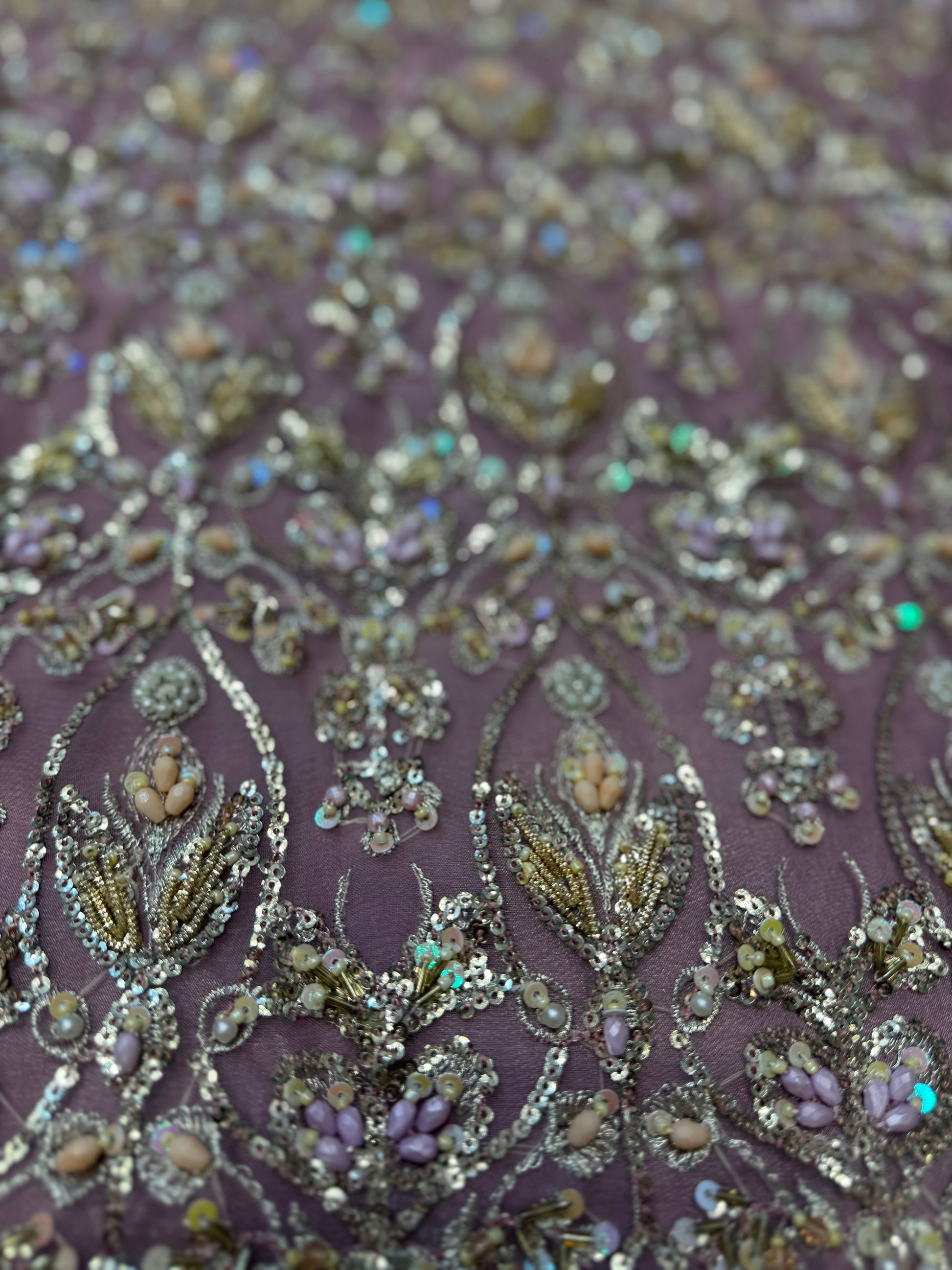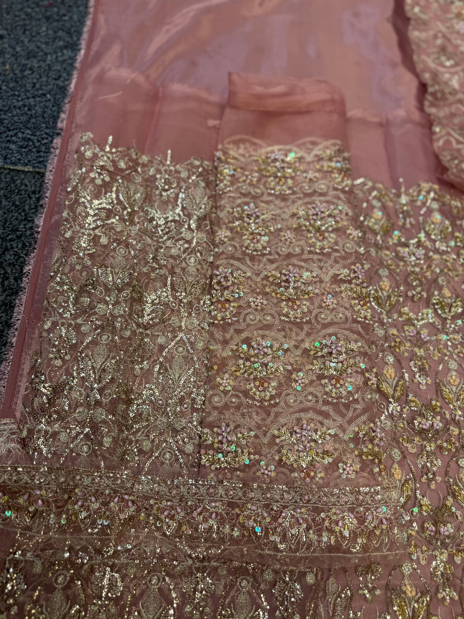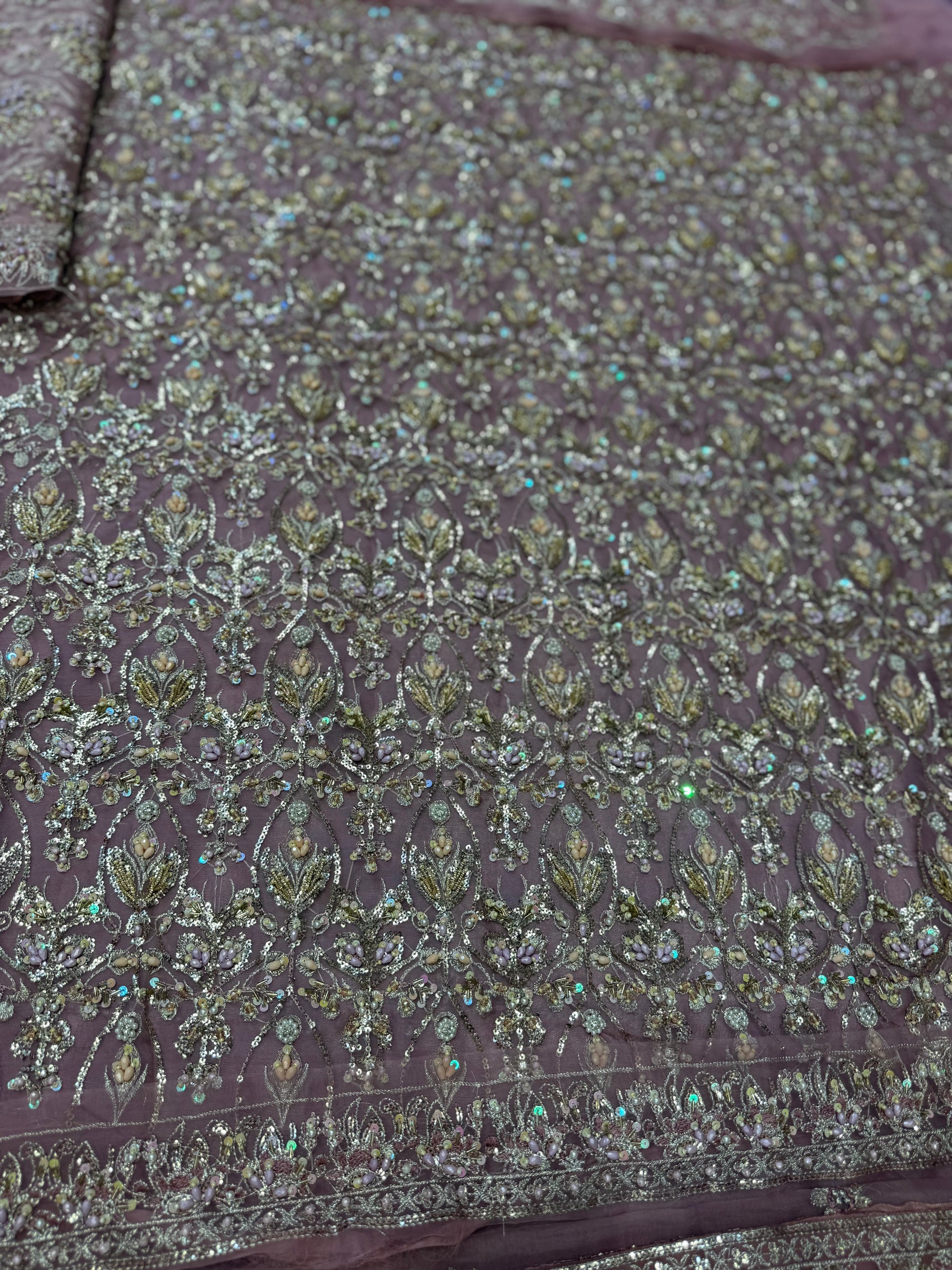- Step into timeless elegance with this orchid toned ensemble. The fully embroidered organza shirt is delicately hand-embellished and finished with slit bell sleeves for a graceful touch. Paired with a separate bustier and sleek Korean silk straight pants, this look perfectly blends classic charm with modern sophistication ideal for weddings, soirées, and special celebrations.