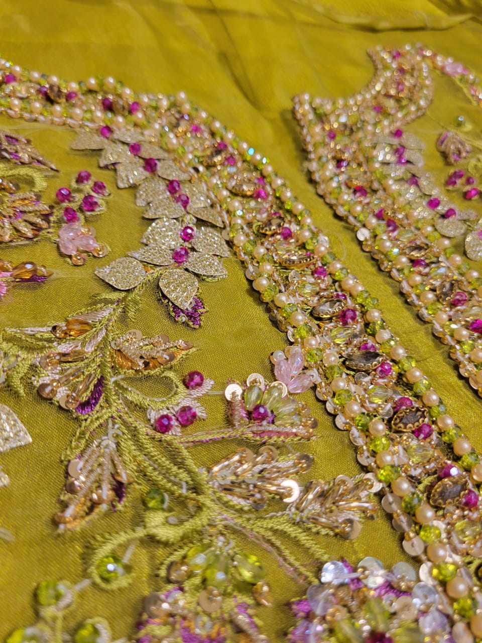 - Heavily front on organza with stones beats, crystal work & pearls.