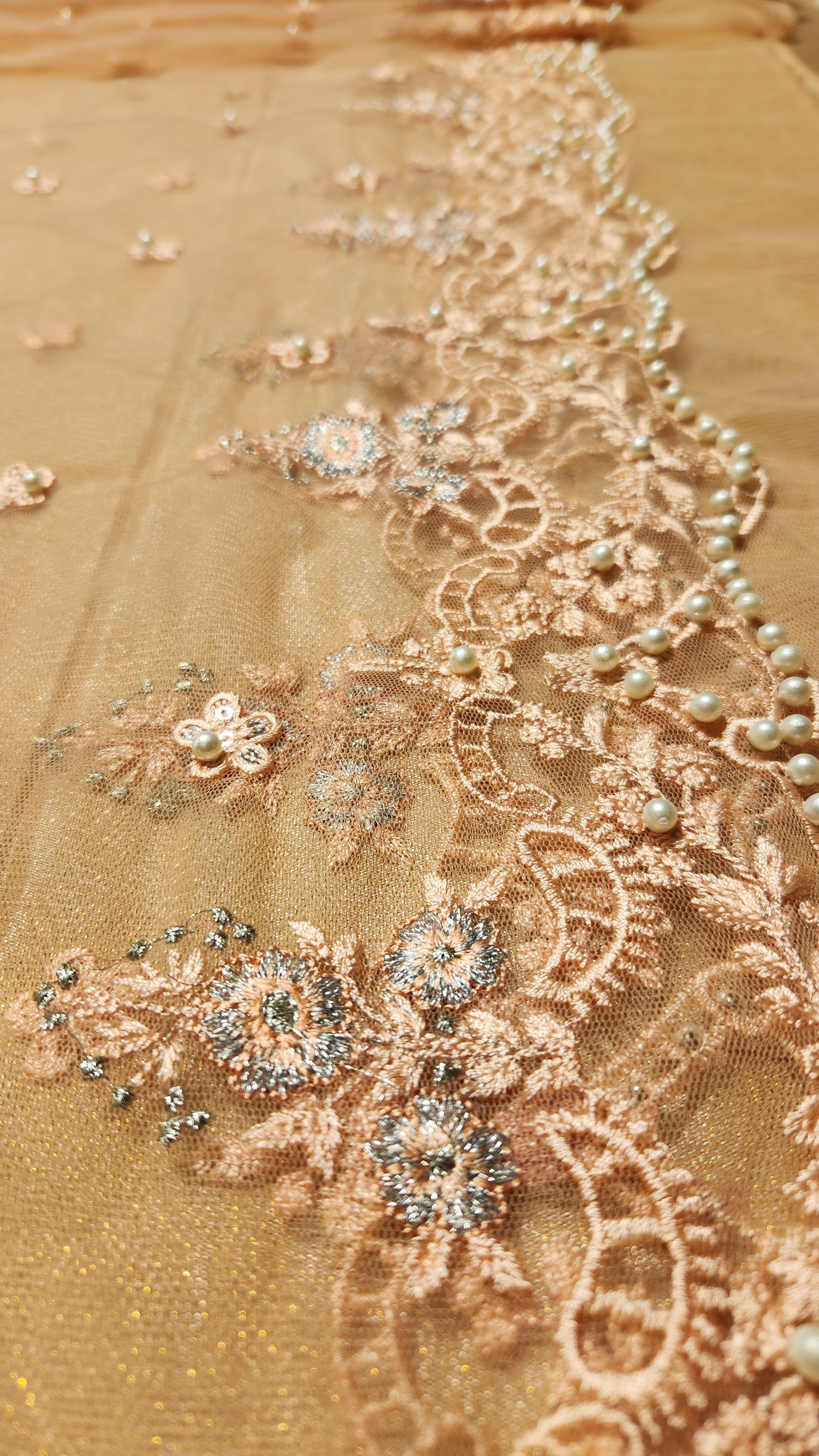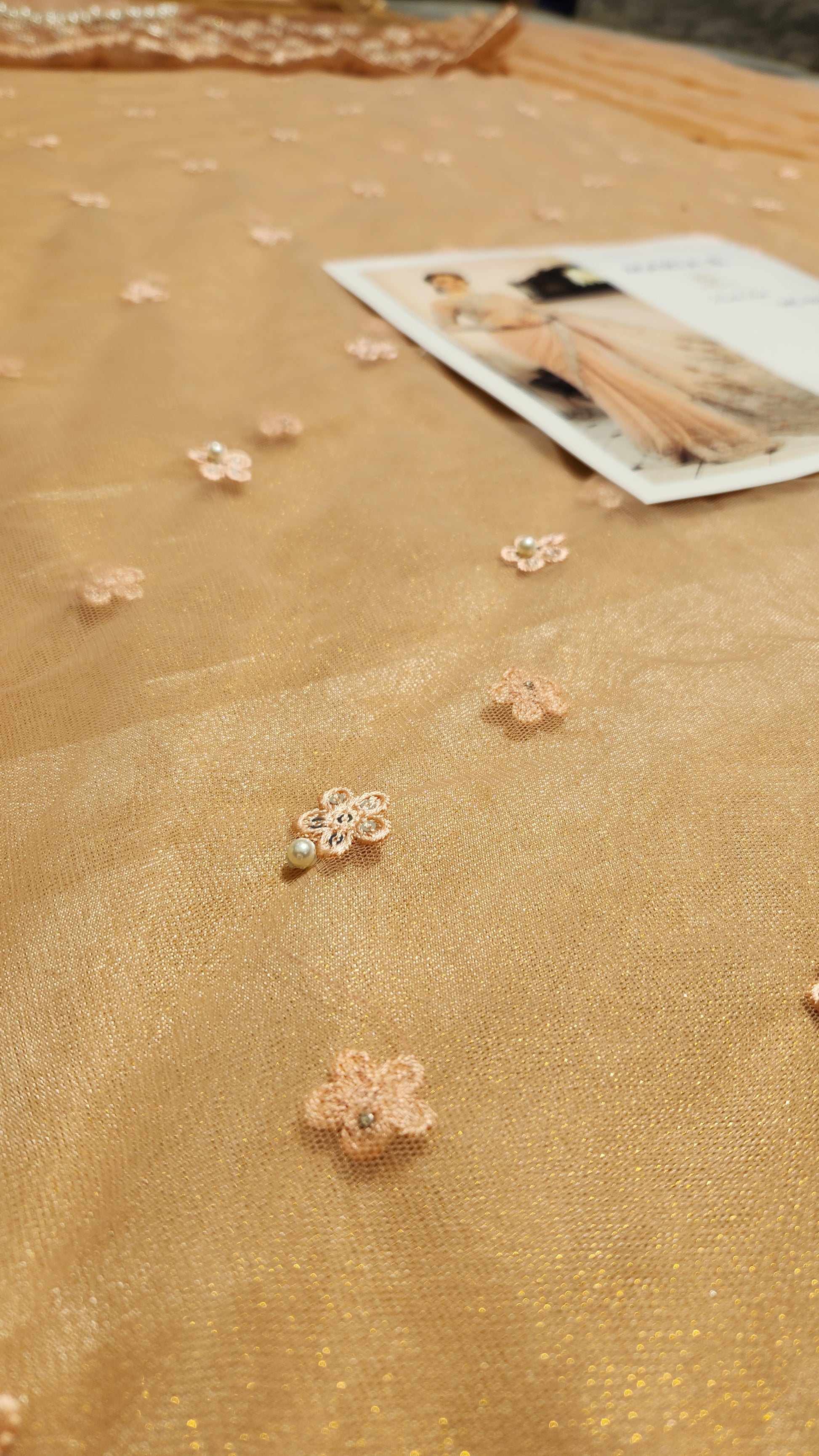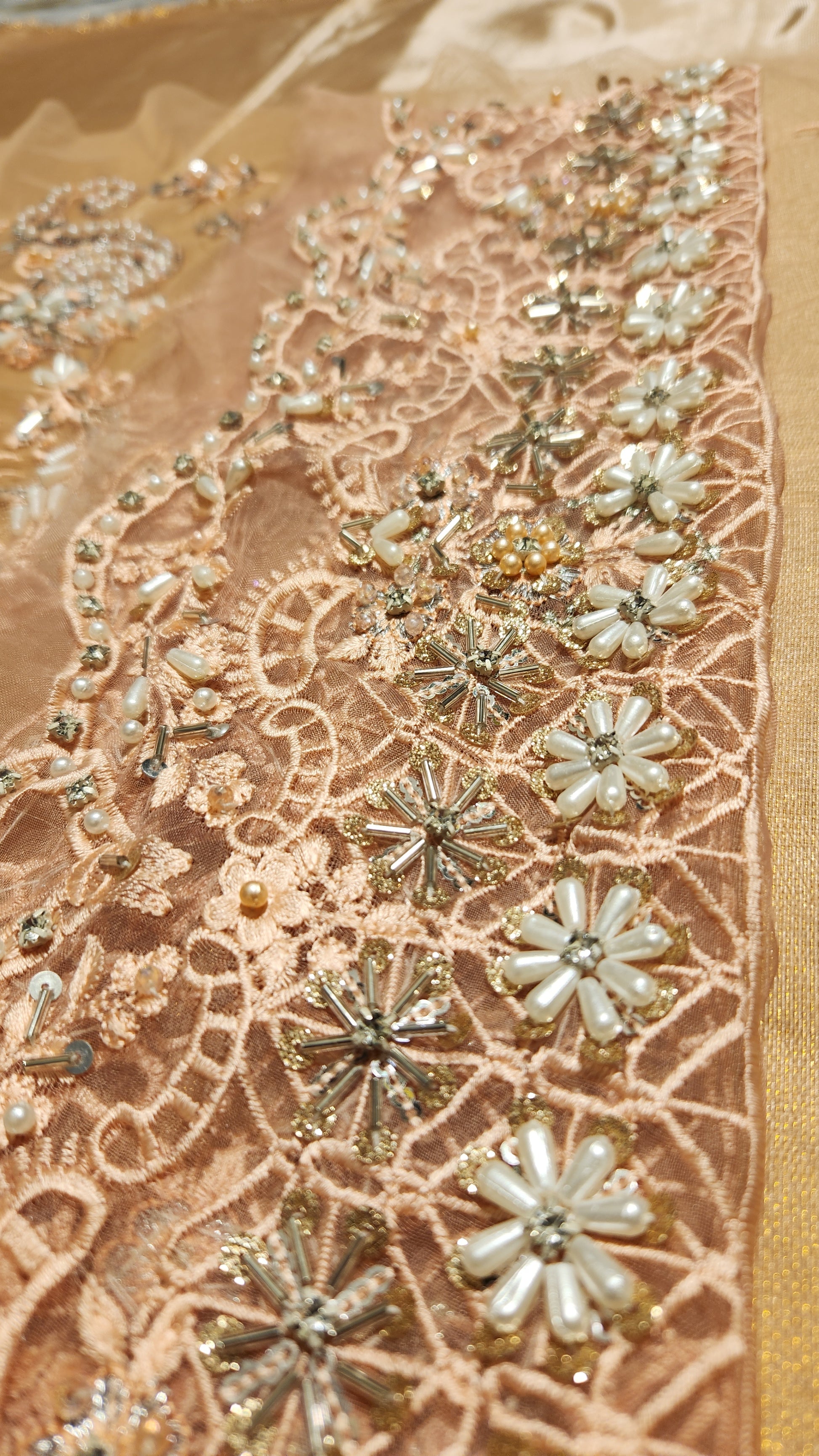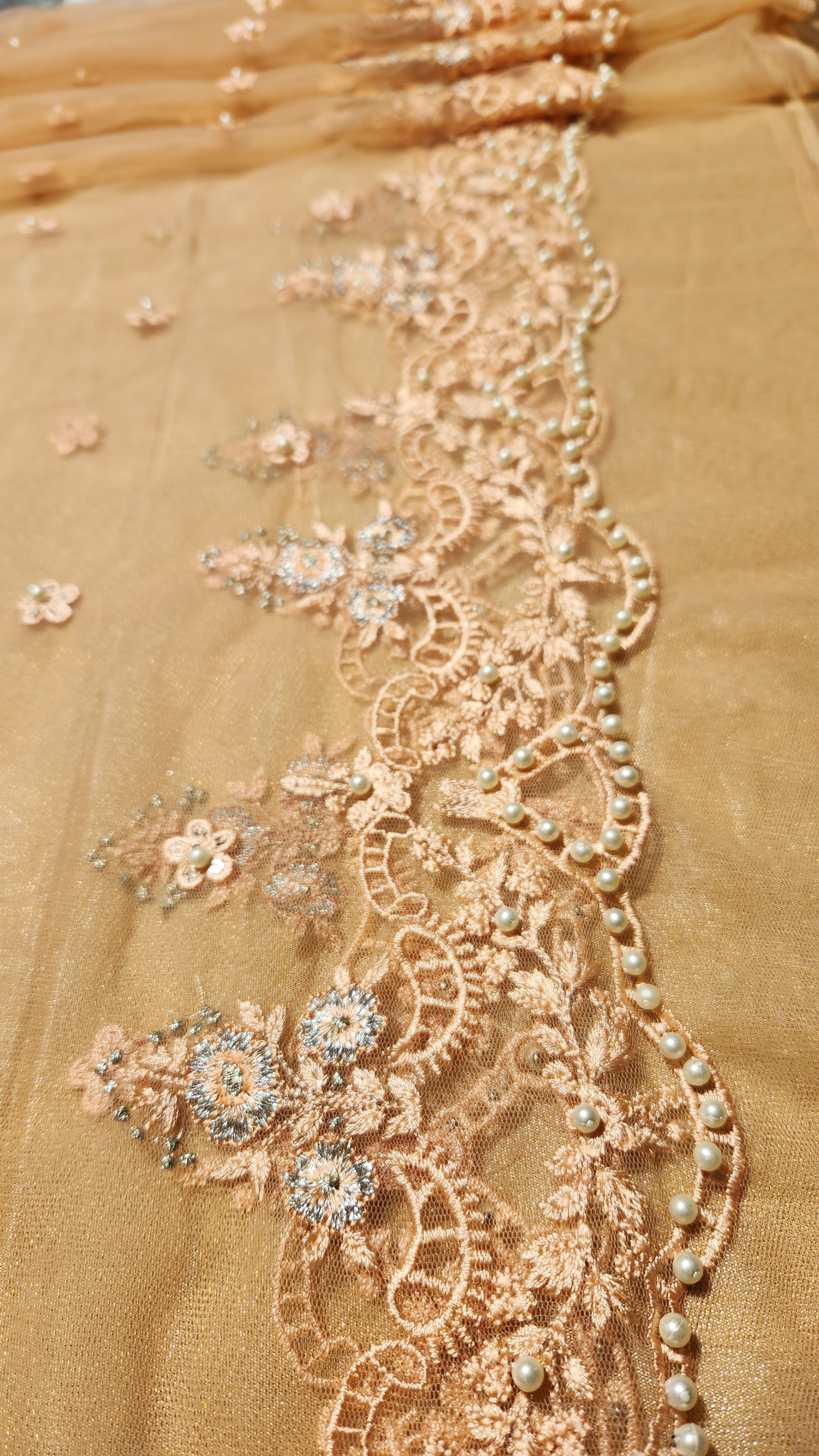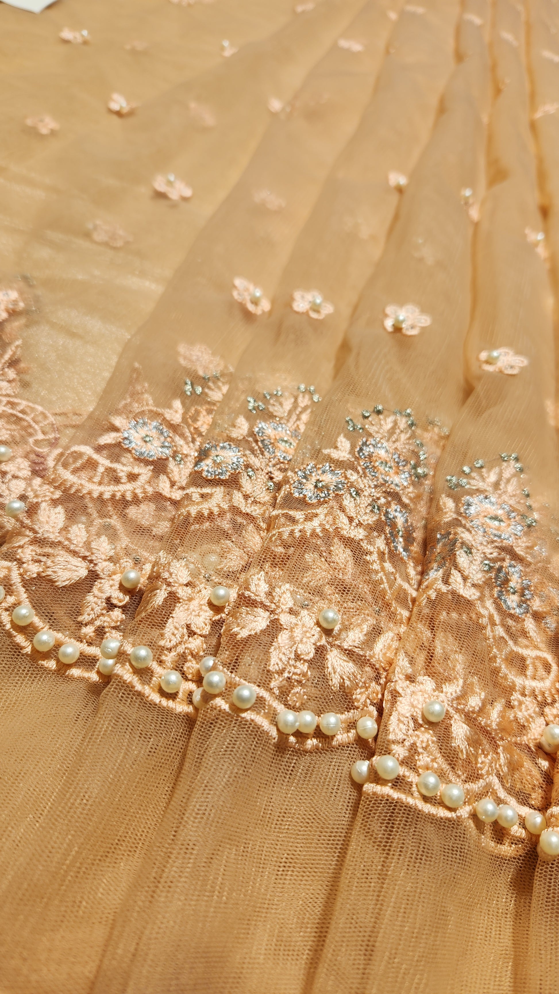 - Saree fall on soft bareeze net with heavy stitch embroidery, sequences, thread & tilla
