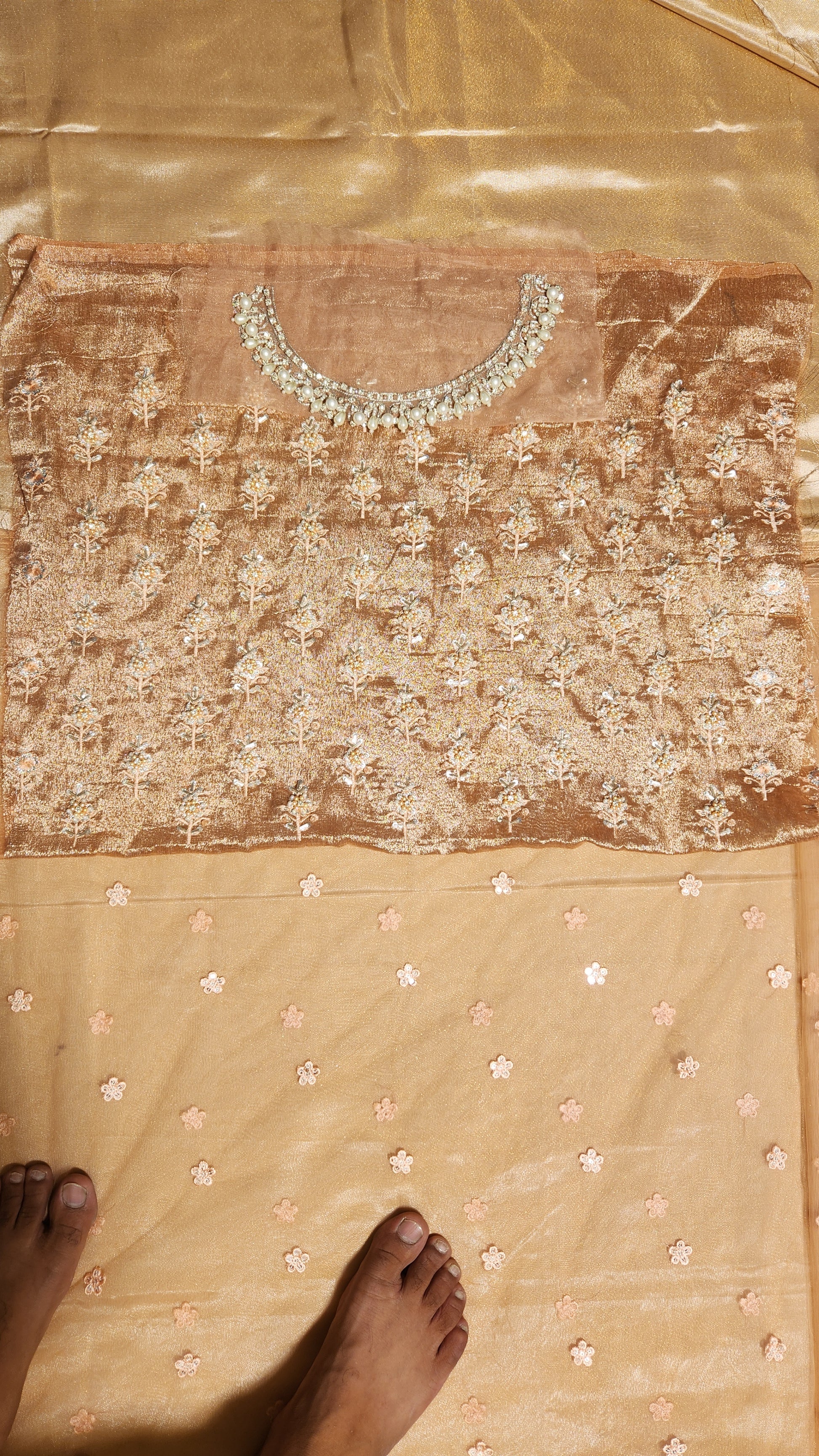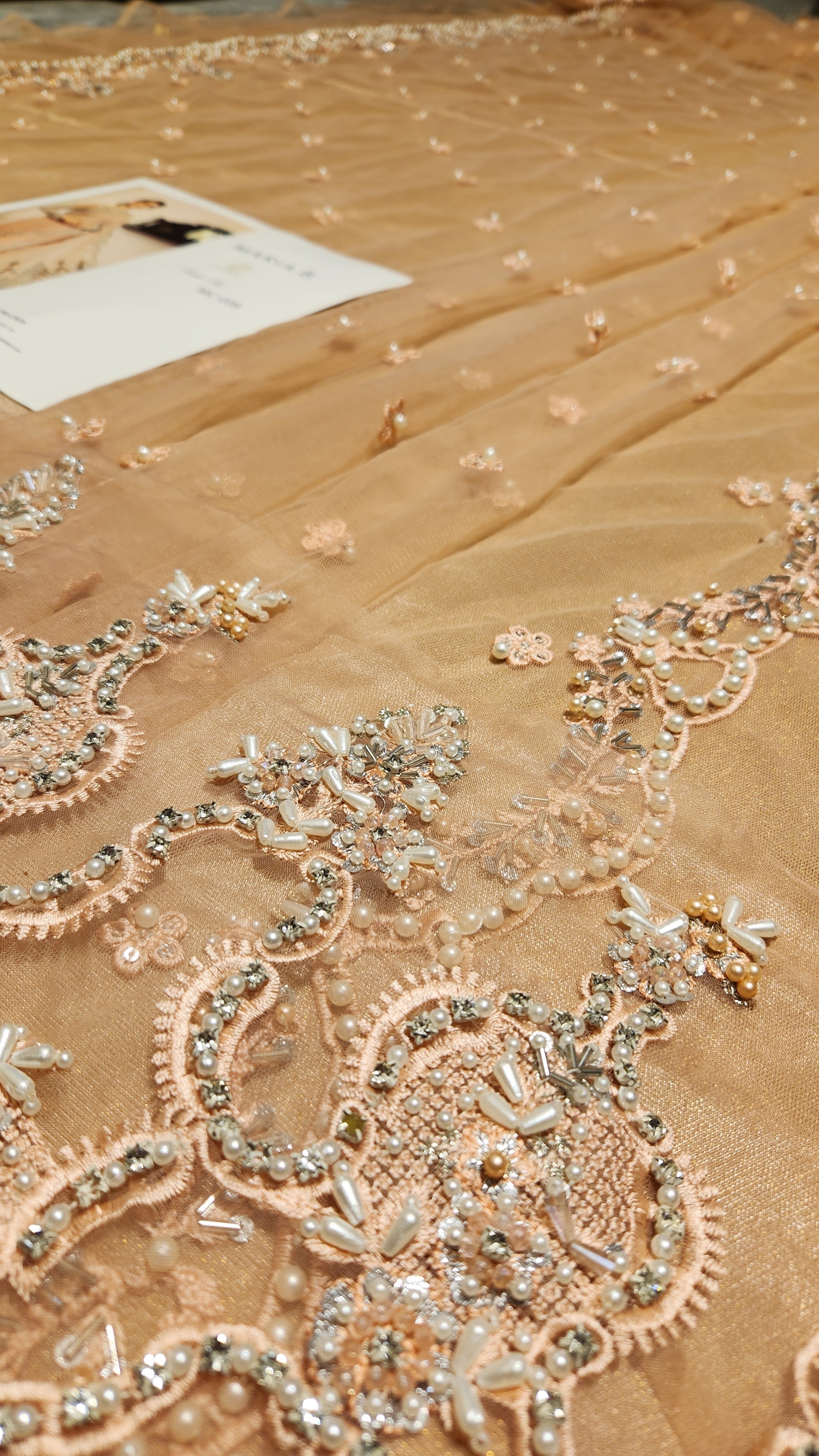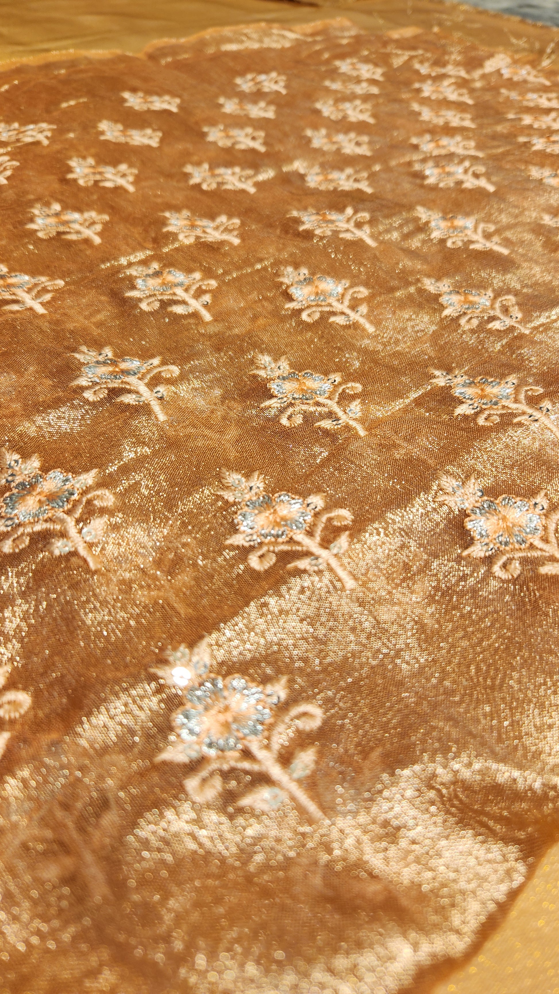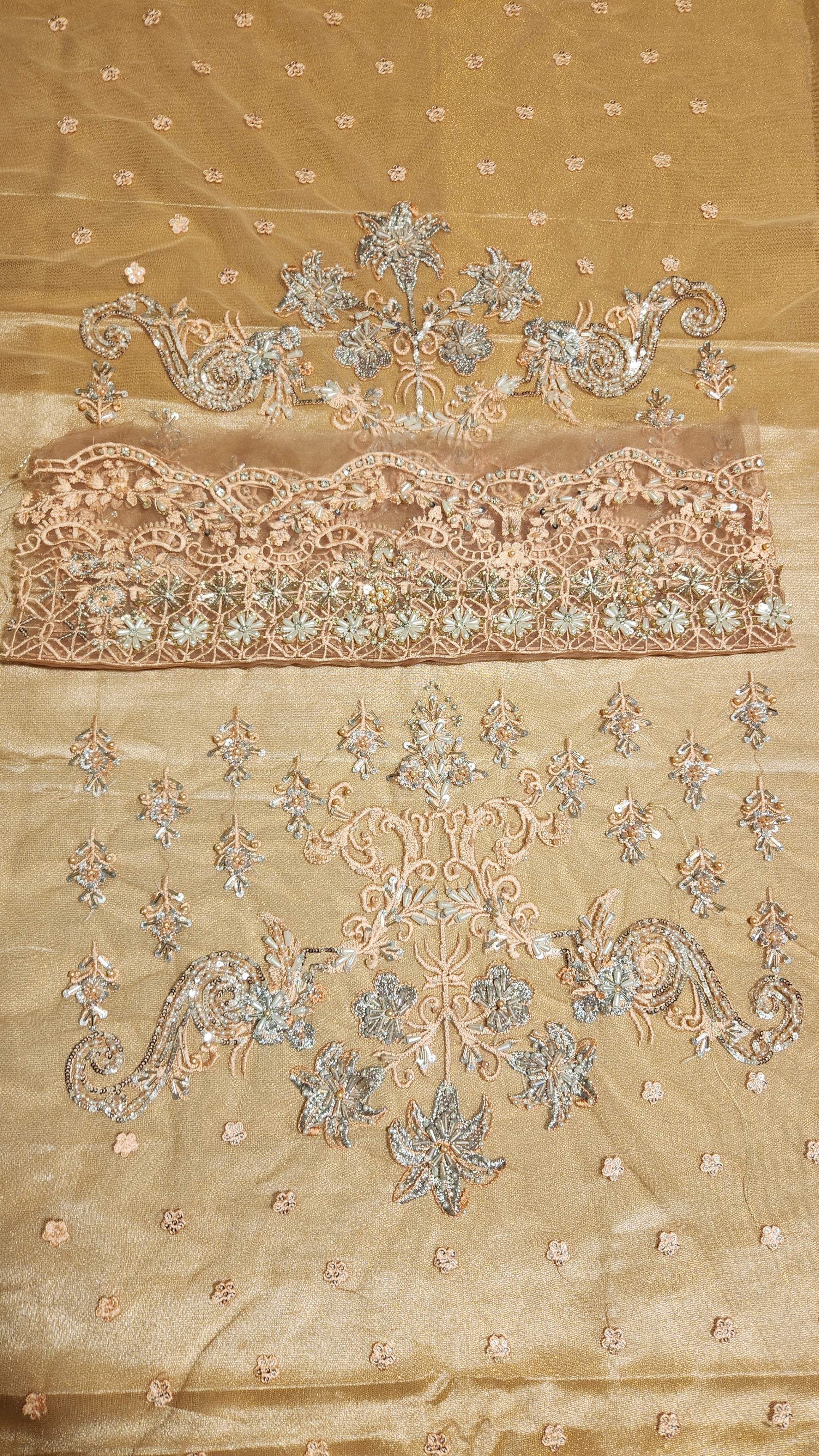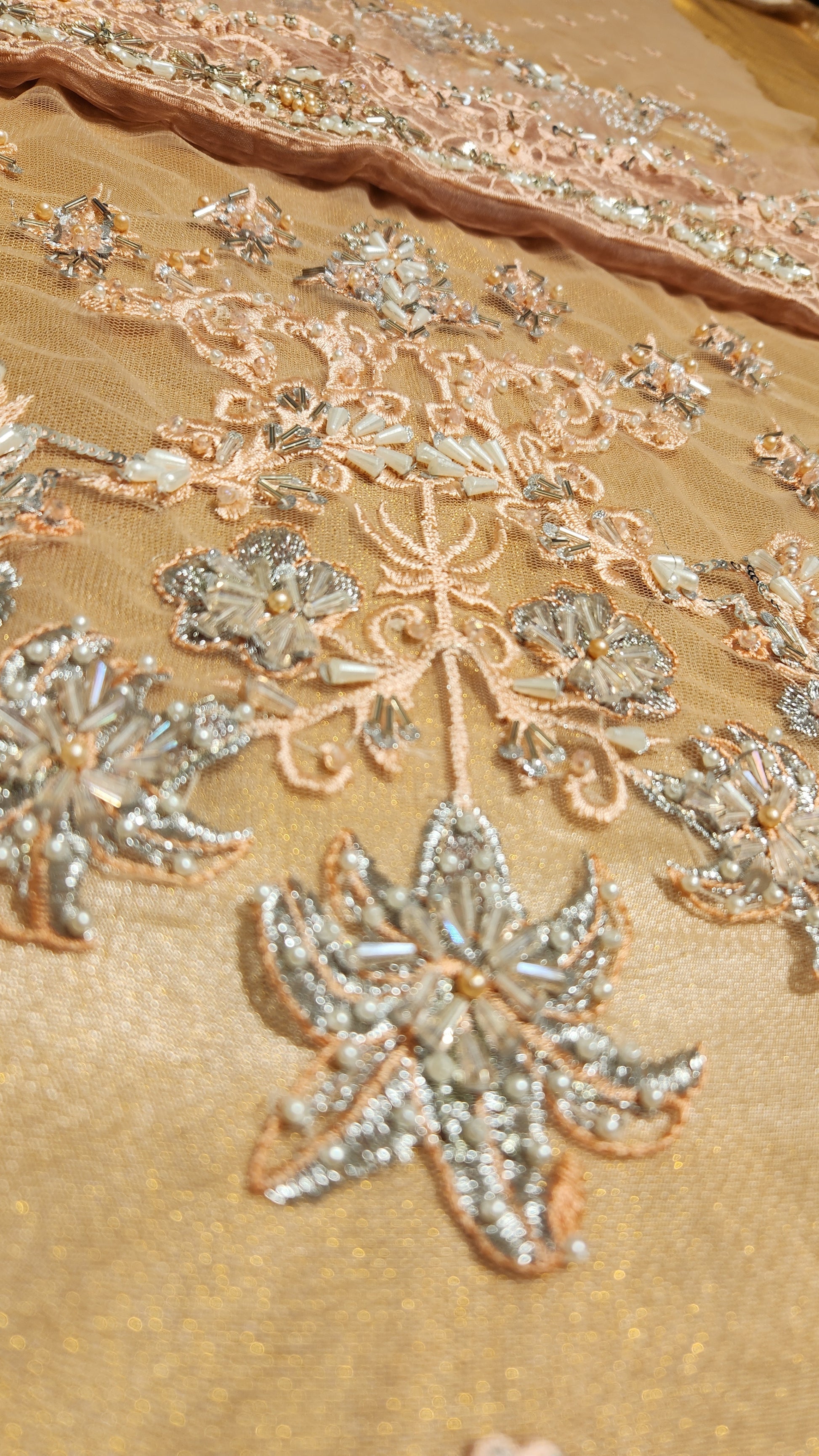 - Saree fall on soft bareeze net with heavy stitch embroidery, sequences, thread & tilla