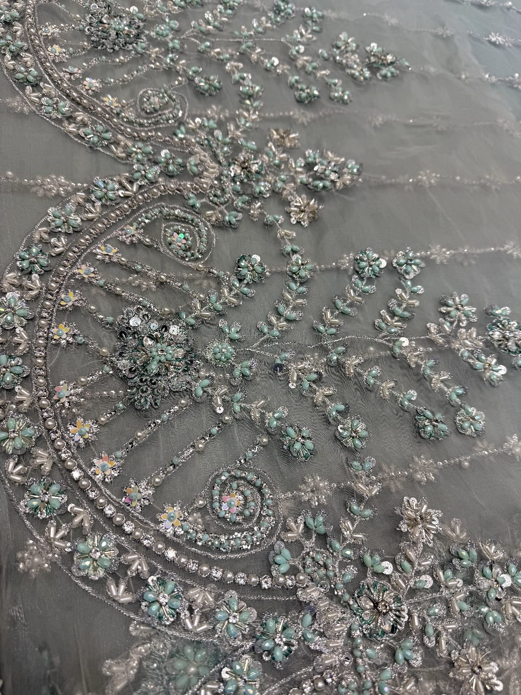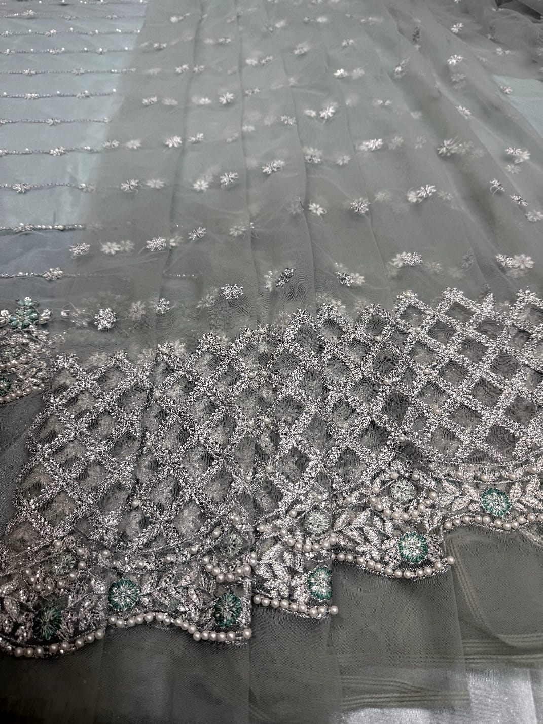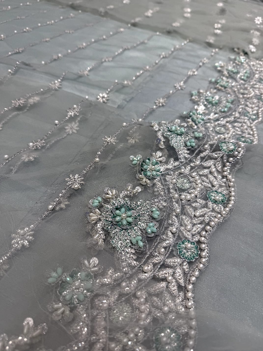 - Handmade sleeves on soft bareeze net with pearls, sequence, stones & 3D FLOWERS.