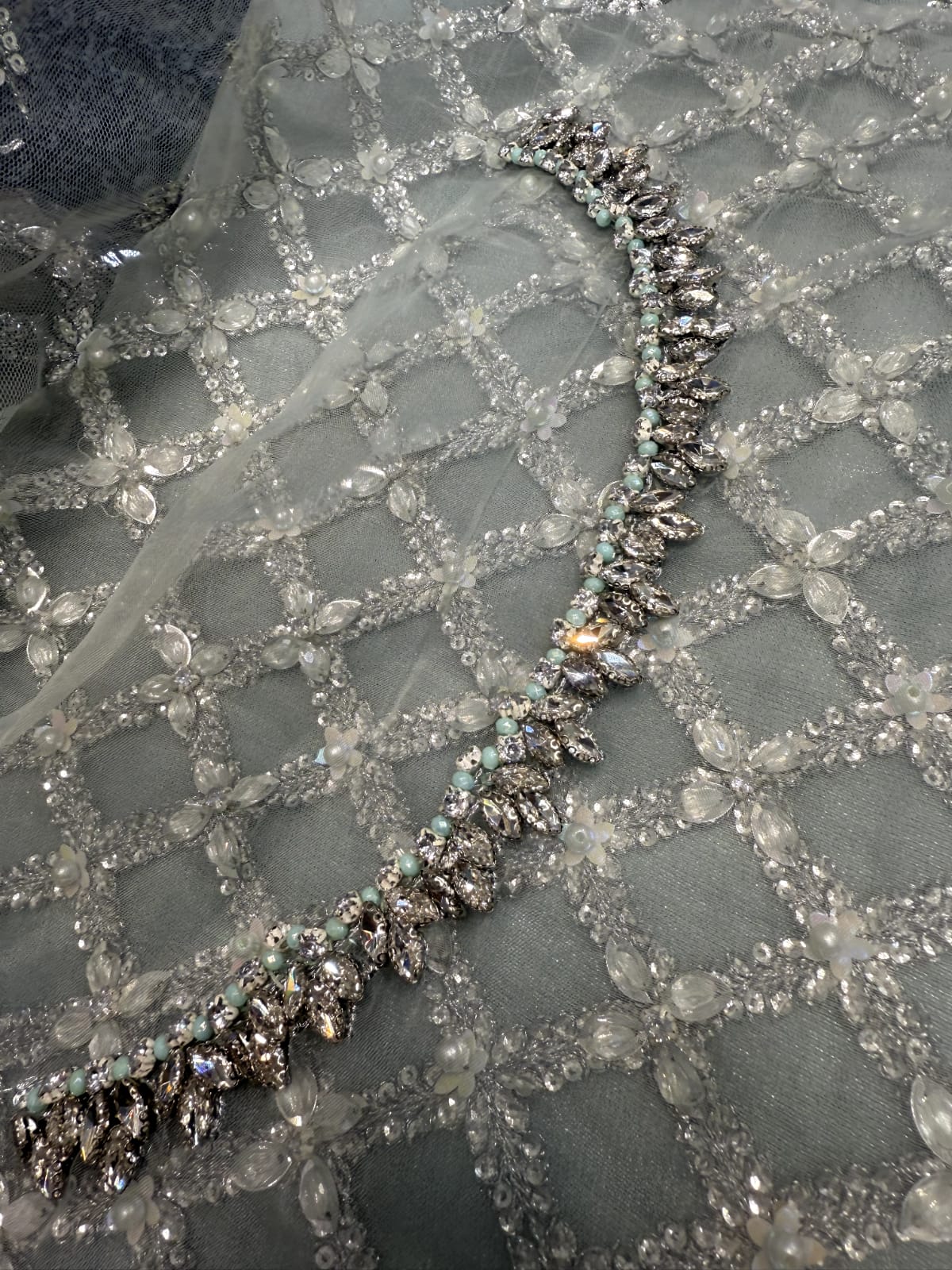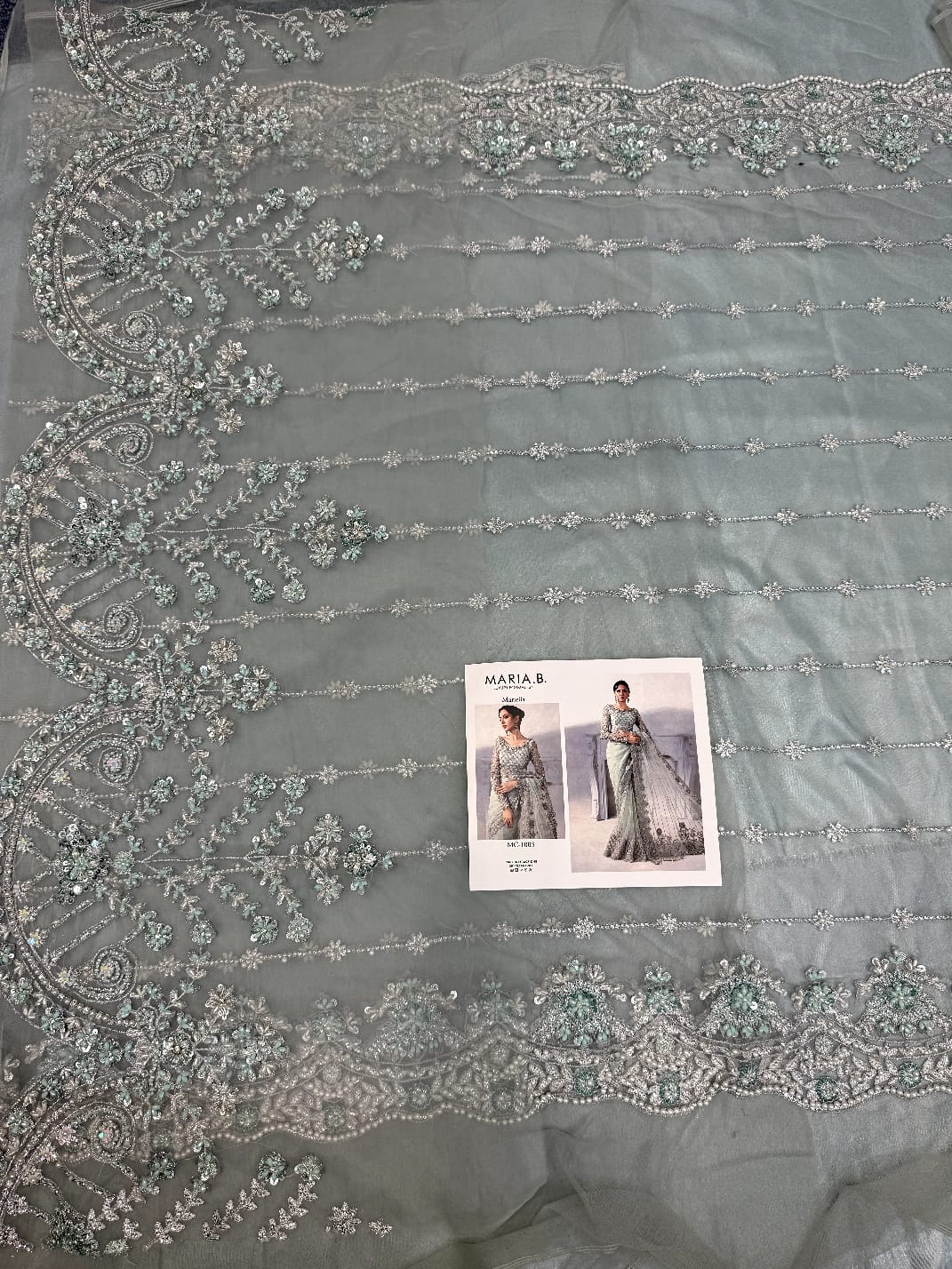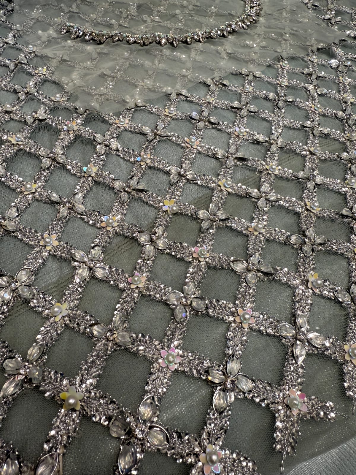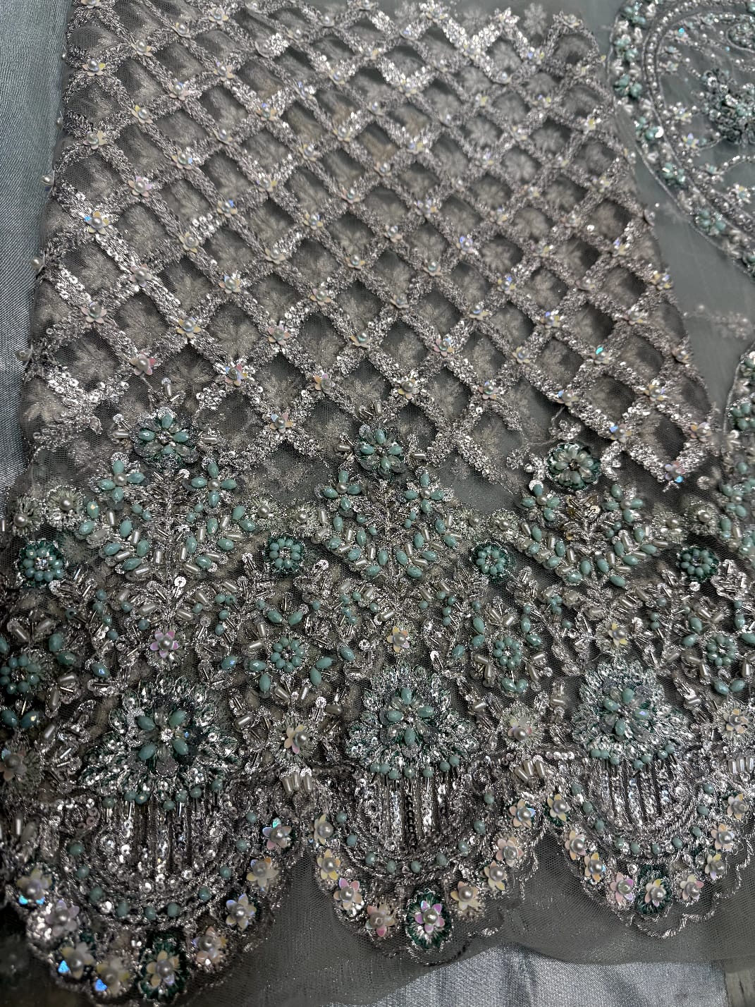- Handmade sleeves on soft bareeze net with pearls, sequence, stones & 3D FLOWERS.