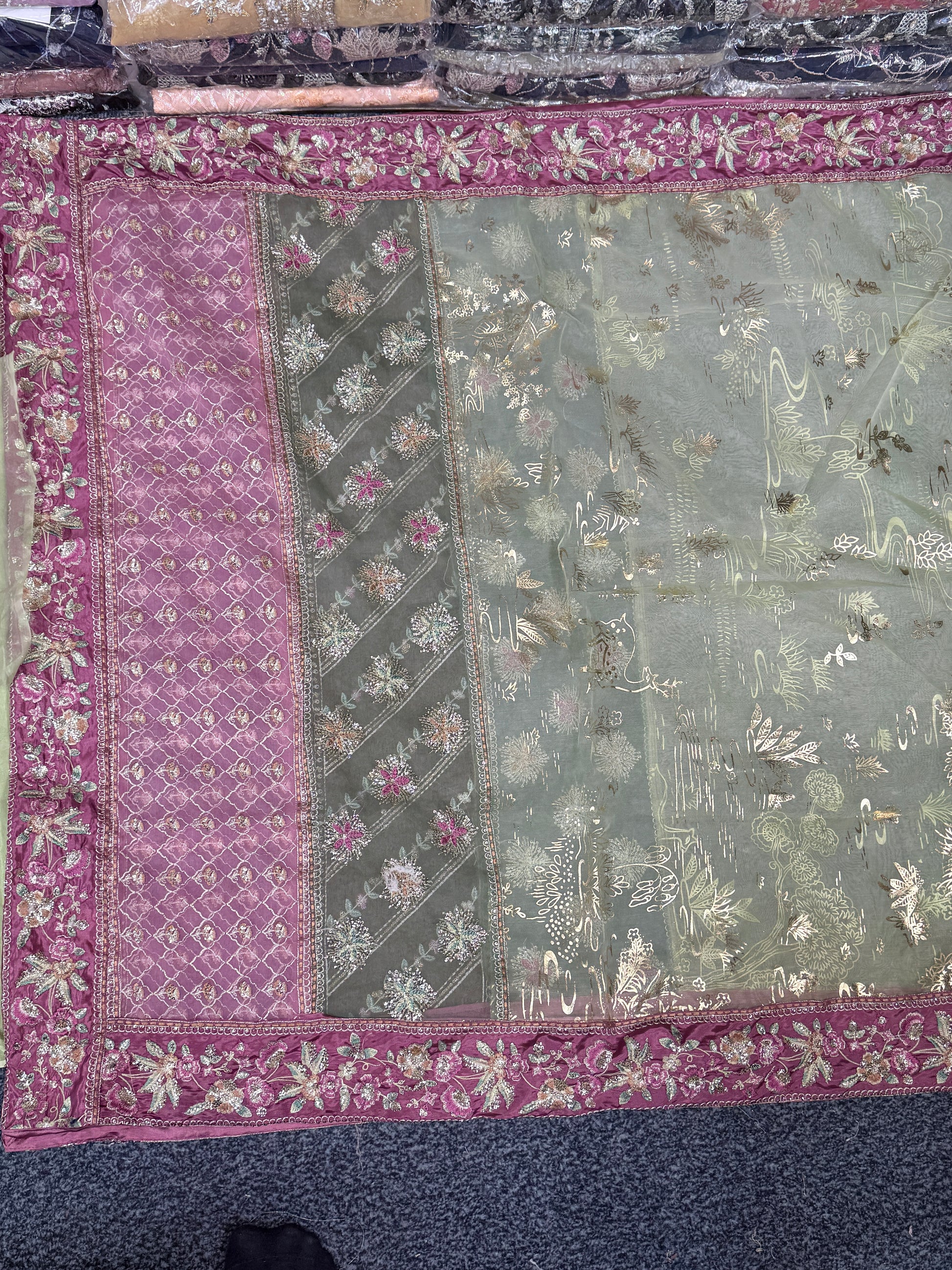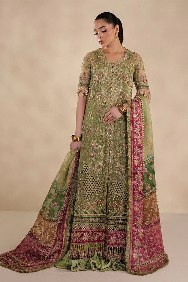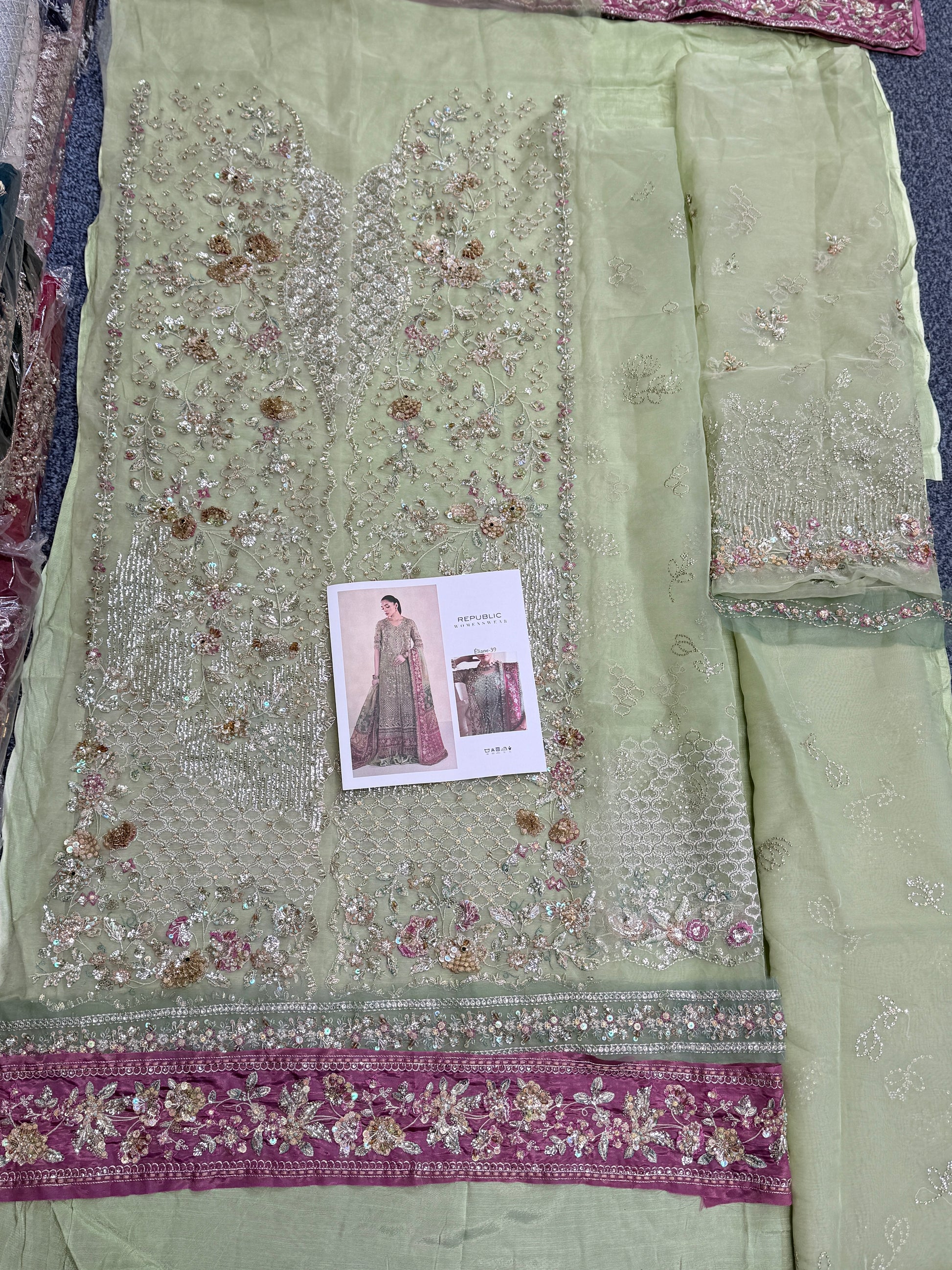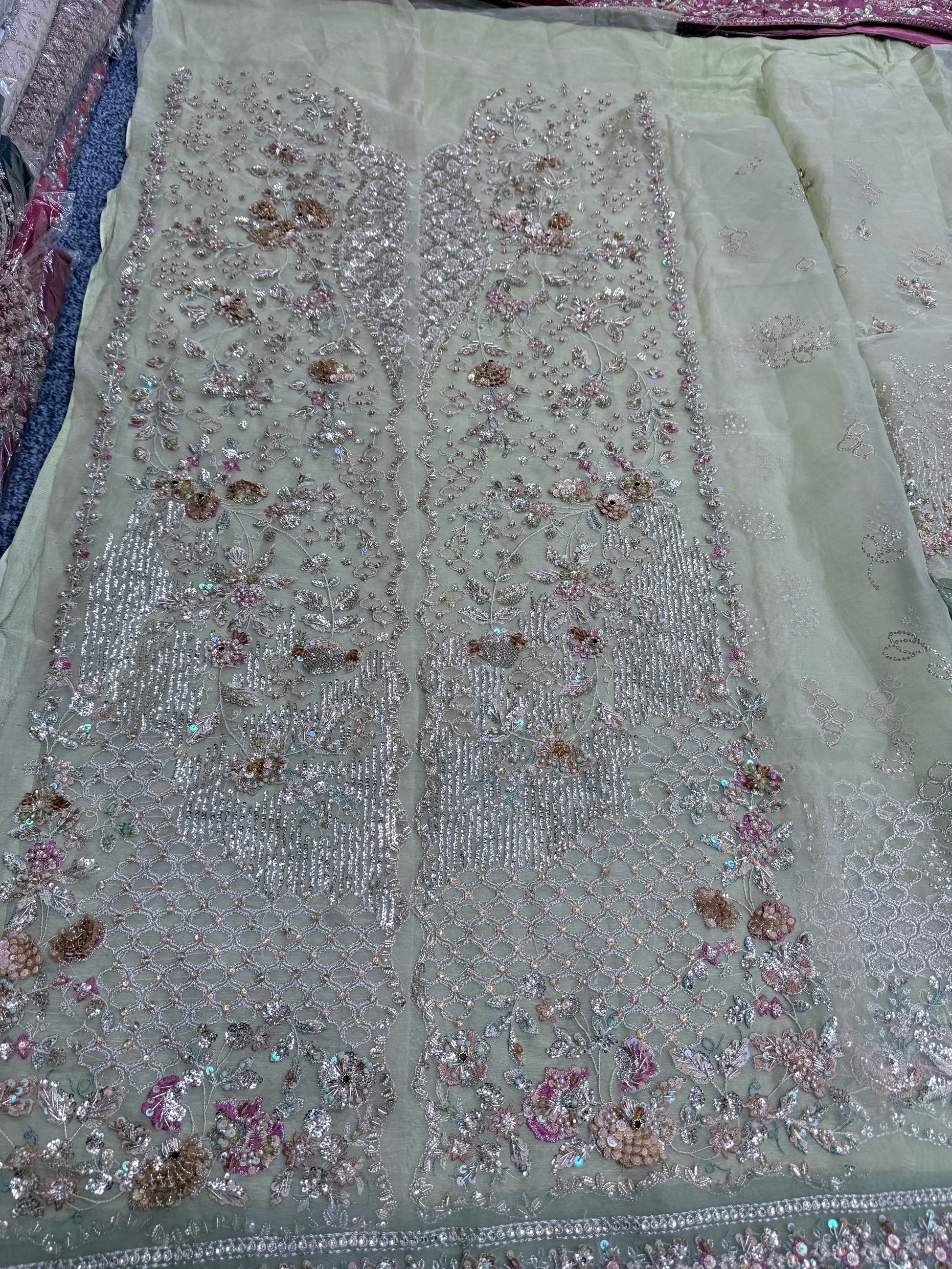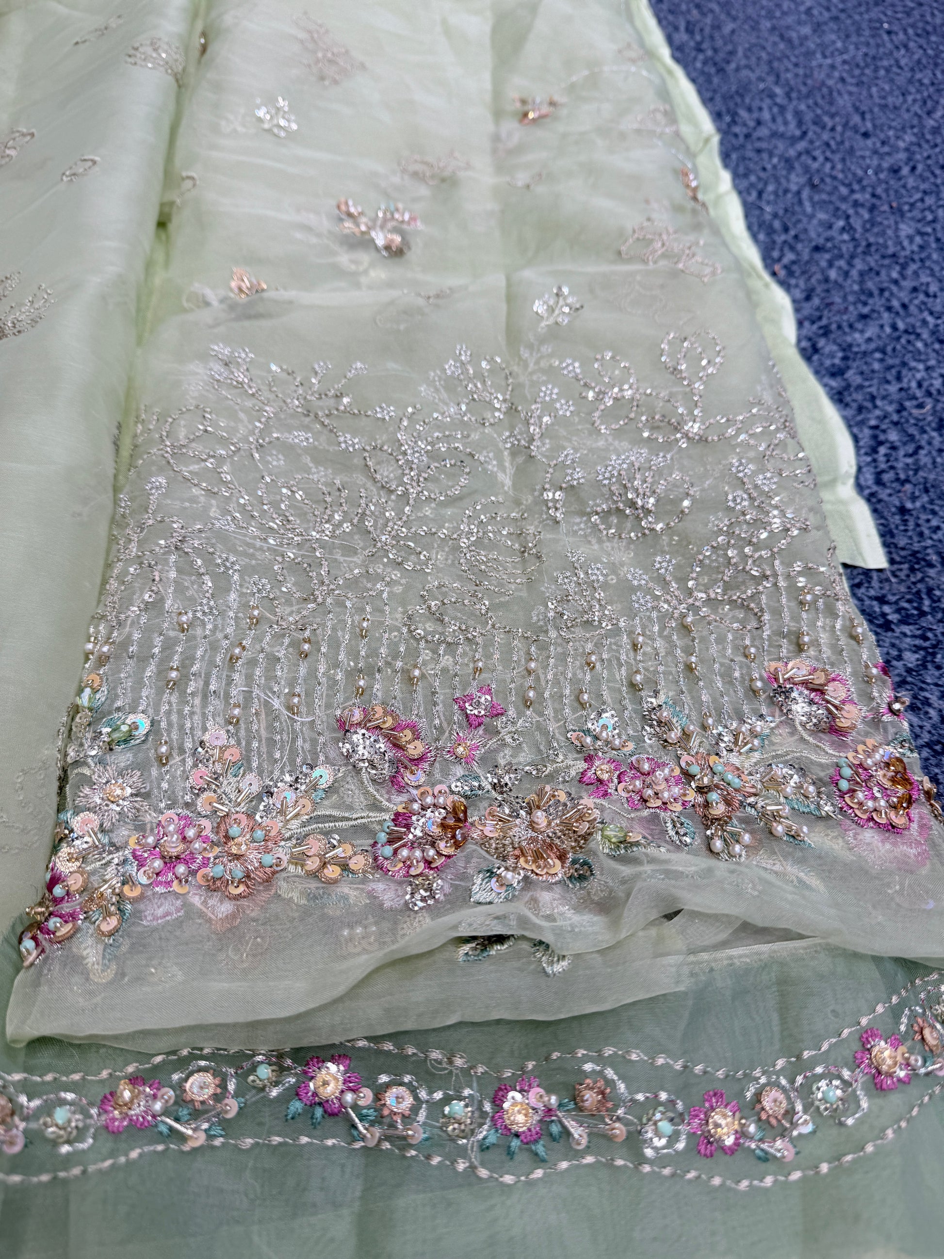 - Heavily front Gown on soft organza right & left panel with kora, stones beats & 3d handwork flowers.