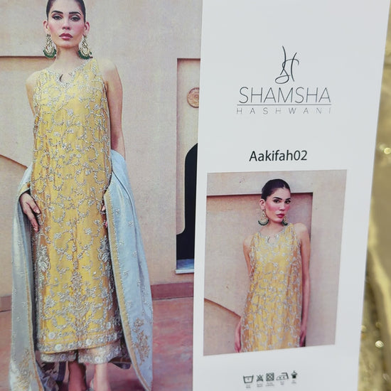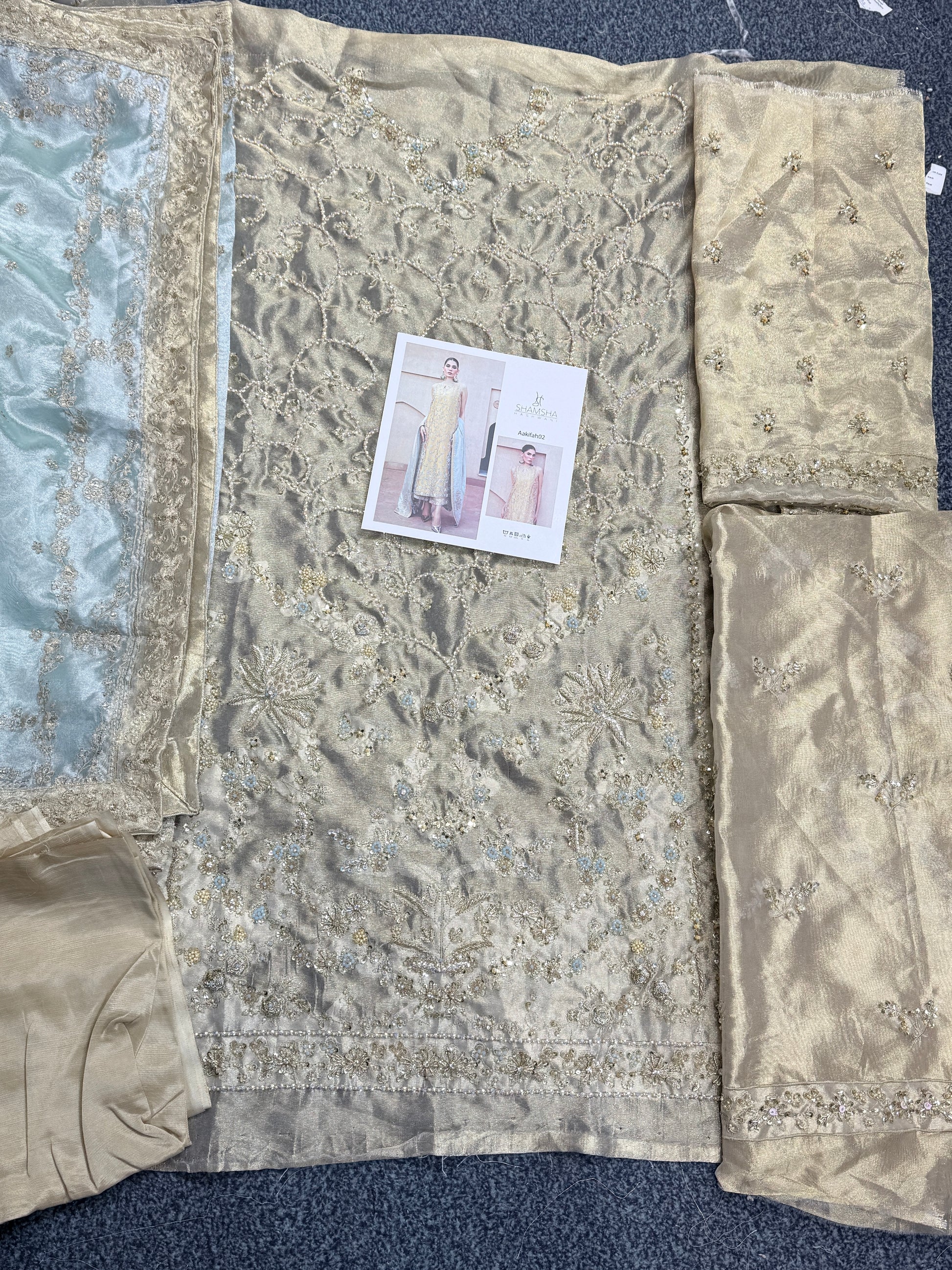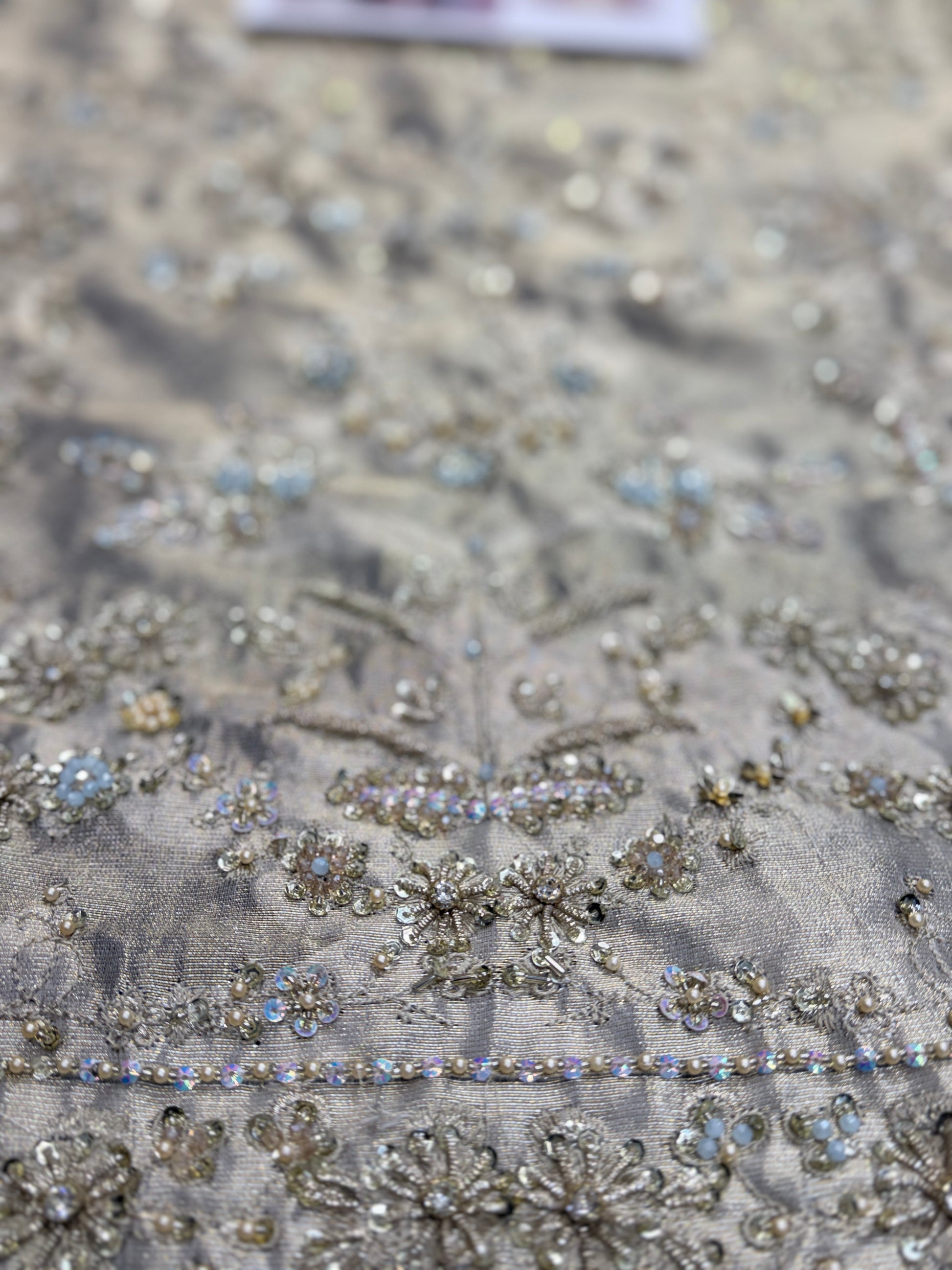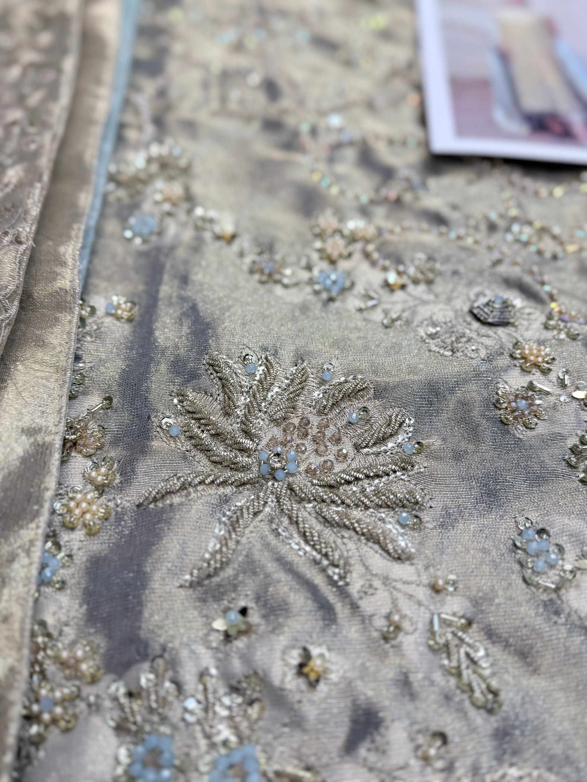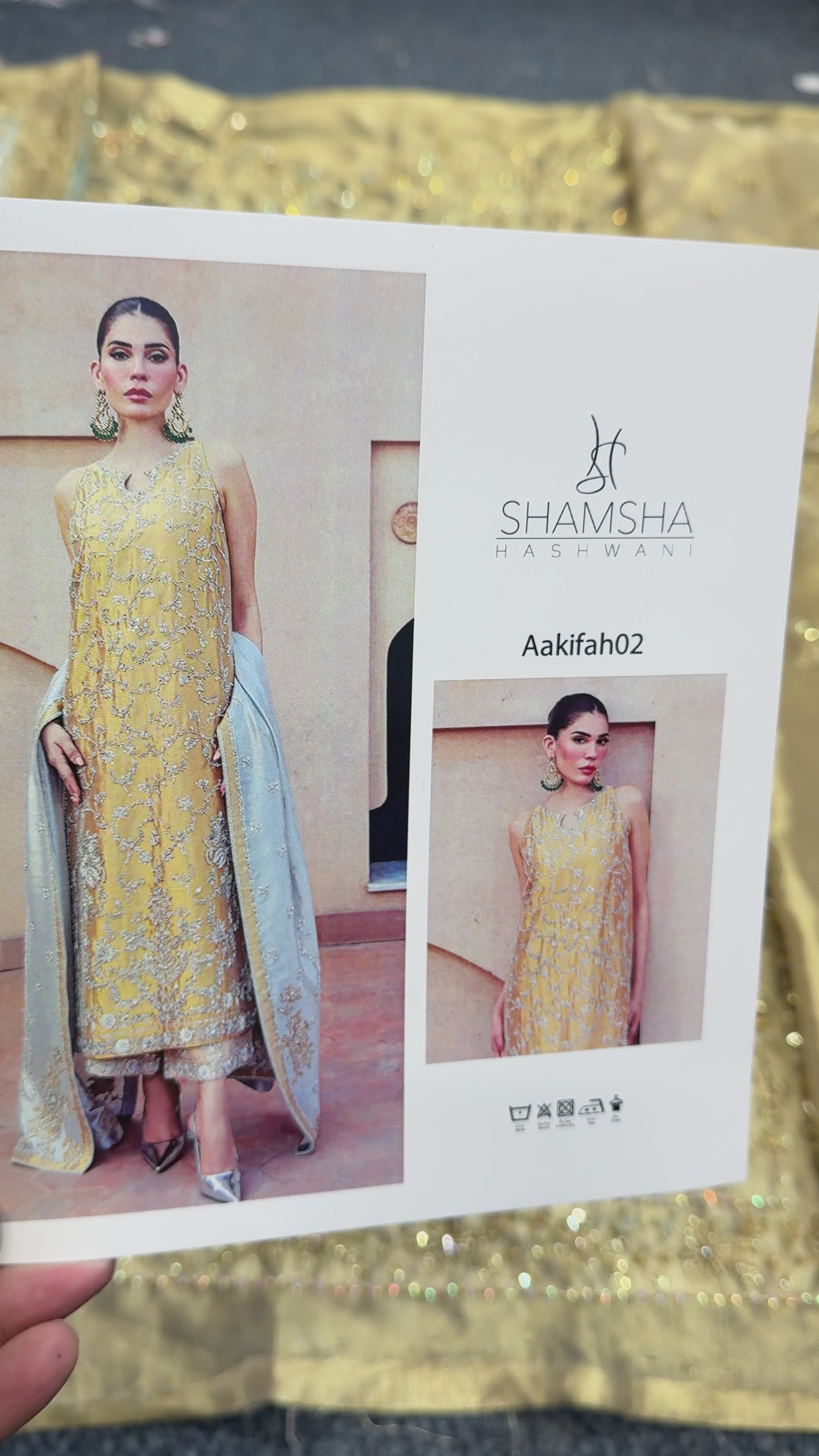 A radiant golden masoori shirt beautifully hand-embroidered on both the front and back, paired with matching banarsi silk culottes and a masoori dupatta, delicately finished with intricate hand embroidery.