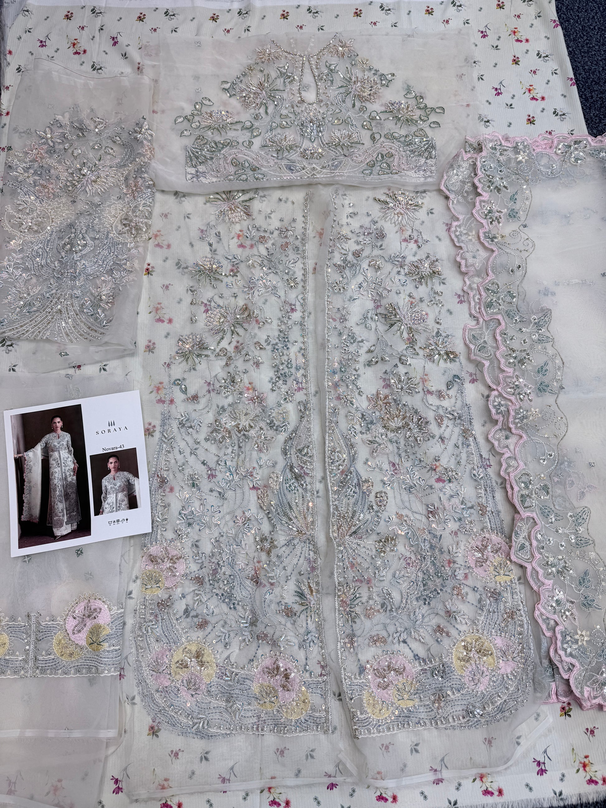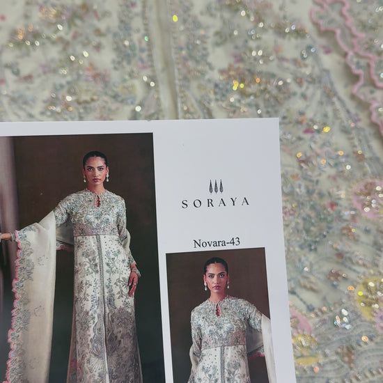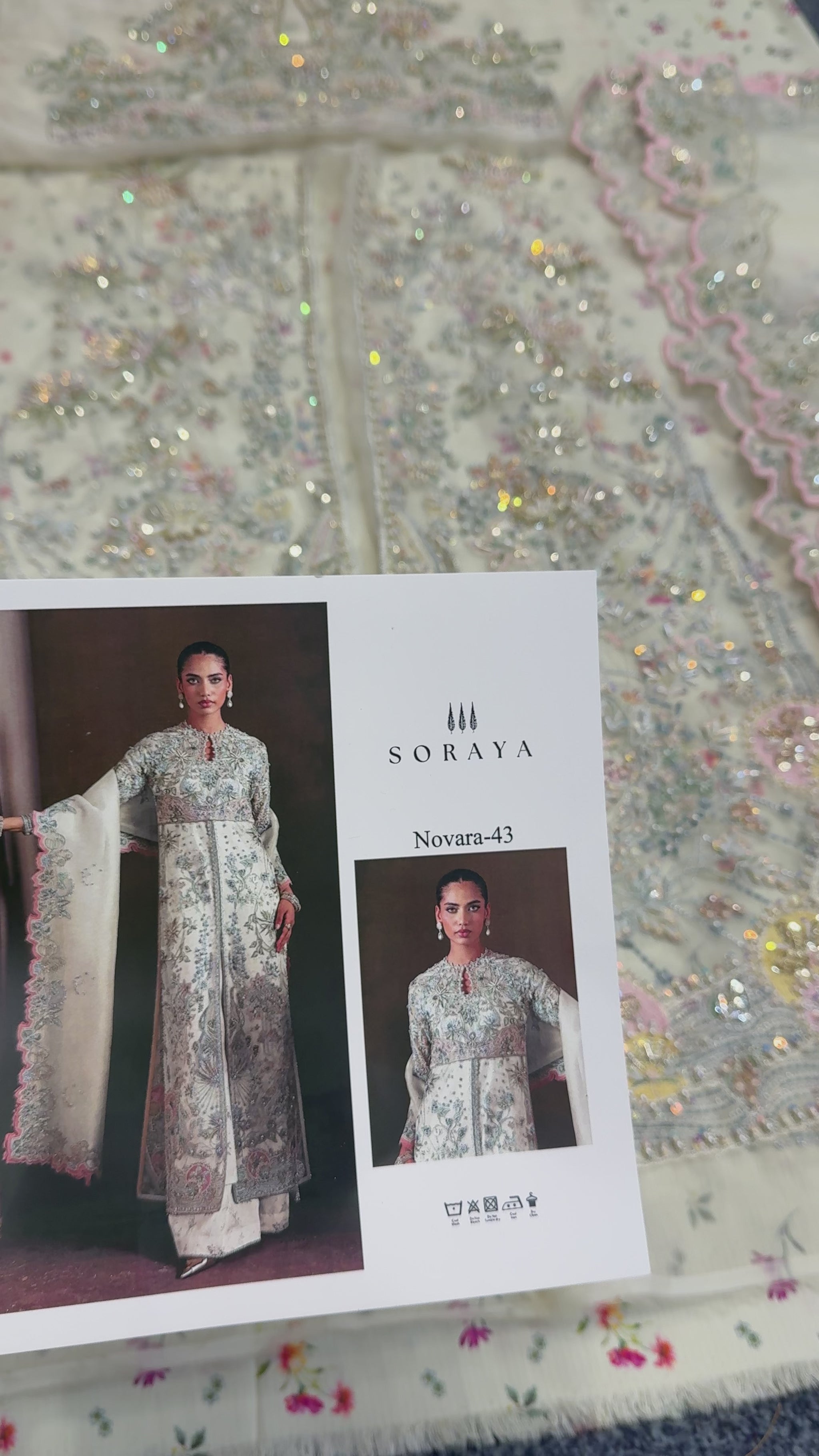 - Soraya brings you a beautiful three piece unstitched ensemble made from premium organza, showcasing detailed embroidery from the Novara collection. The luxurious fabric drapes softly and gives an elegant, airy feel perfect for creating refined formal outfits. Since it’s unstitched, you have full freedom to design and tailor it exactly the way you like. Ideal for weddings, celebrations, and special events, this outfit blends traditional craftsmanship with a modern, stylish touch. The delicate embroidery adds charm and sophistication, making it an excellent choice for anyone looking for bespoke luxury in their wardrobe.
