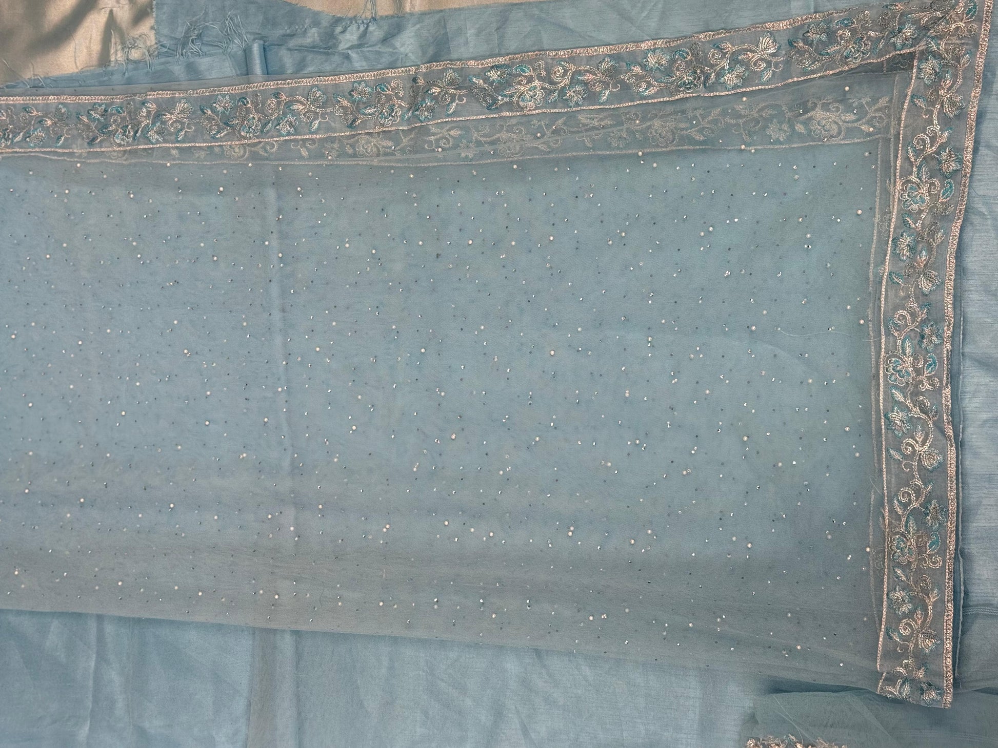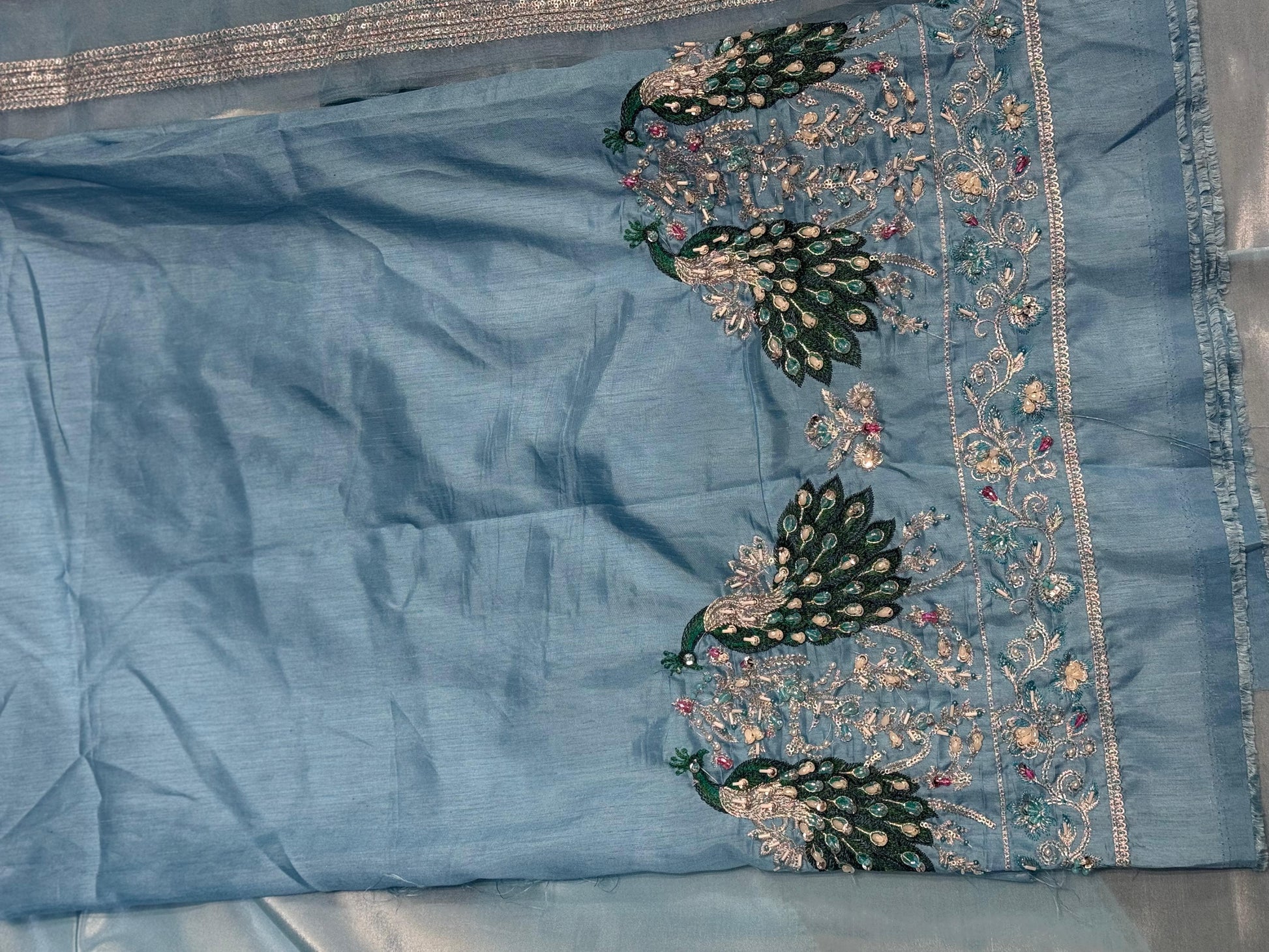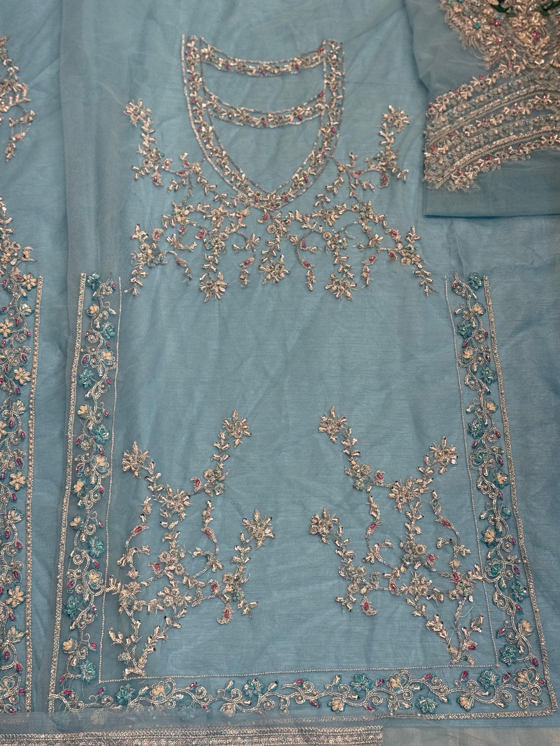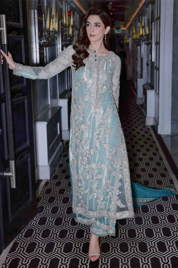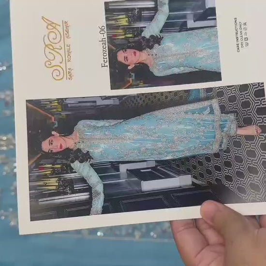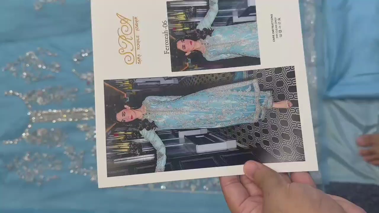- Ferozeah" is a stunning aqua-toned long shirt adorned with intricate silver embellishments and delicate handwork. The sheer dupatta features a heavily embellished border and scattered sequins, adding an ethereal touch. Paired with straight-cut trousers with bejeweled peacock hem details, this ensemble blends traditional artistry with contemporary style, perfect for making a statement.