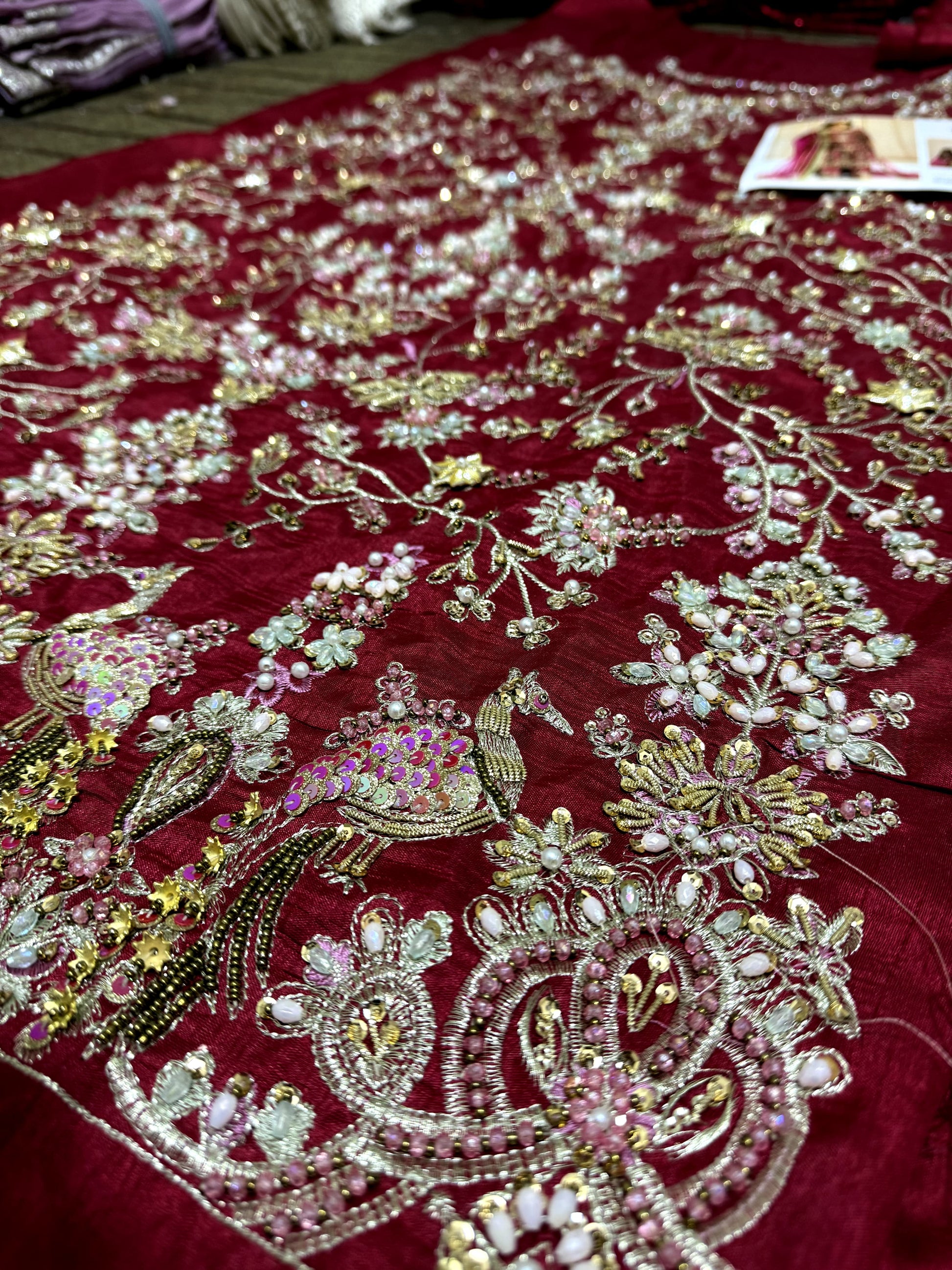 - Handmade sleeves adorned with pearls and beads on raw silk.
